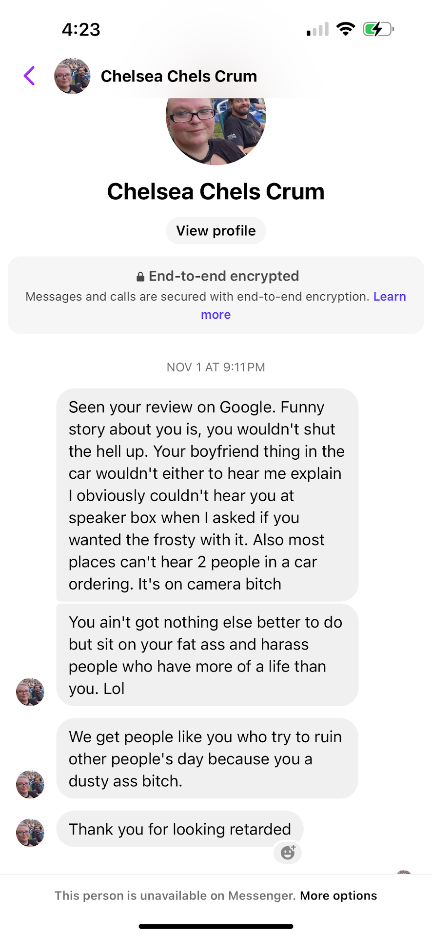 Read moreOrdered 2 meals tonight in the drive thru. Didn’t realize that the crabby patty meal doesn’t come with a soda. Told the girl there was supposed to be 2 sodas and she rudely told us the frosty replaces the soda, all fine and dandy, but when we were trying to get her to stop making excuses as to why she didn’t hear there were 2 sodas, she told us to stop being loud and slammed the window on us, ummmm if she would have shut up for 5 seconds she would have heard us willing to pay for another soda!!!!!!! Clearly this is the only job she could get!!! I will NEVER go back!!!! I willl drive all the way to hwy k if I have to!!!! Worst Wendy’s in Missouri! UPDATE; this is the response I received from the girl at the window look at the photo please!!!!...