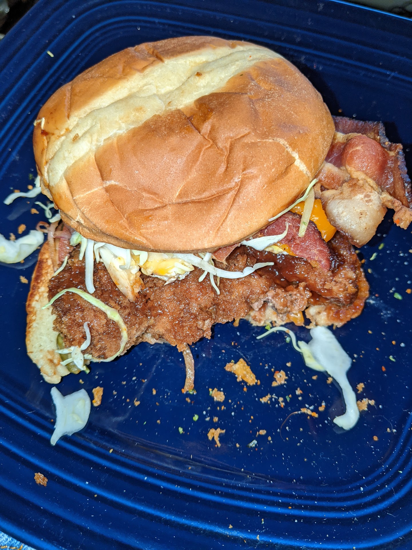 I do not like mayo, mustard, or any of their friends. I do not like sweet pickles nor do I like the mistake that is "bread and butter" pickles. I did ask about the type of pickle beforehand. I confirmed they were not sweet pickles. It did not occur to me that anyone would have so much hate in their hearts for their customers so as to taint their burgers with "bread and butter" pickles. To be fair, these may just simply be "the worst dill pickles on the planet" and not full on "bread and butter". Regardless, they were unpleasant so I removed them after the first bite. However, in that first bite was another 'seriously off' flavor component. Something like allspice/cinnamon...what, to me, potpourri would taste like. Turns out that foulness comes from the tonkatsu sauce. I've had other variants of tonkatsu and it was fine. This stuff is just wrong. I tried to 'push through' the eating of the burger. After the 3rd bite, I just couldn't do it. There's a hint of expected normalcy/goodness wrt to flavors and then there's this disconnected flavor of crushed dreams, lost hope, and death that just lingers. The image shows that there was a bit over 2/3 that had to be trashed.