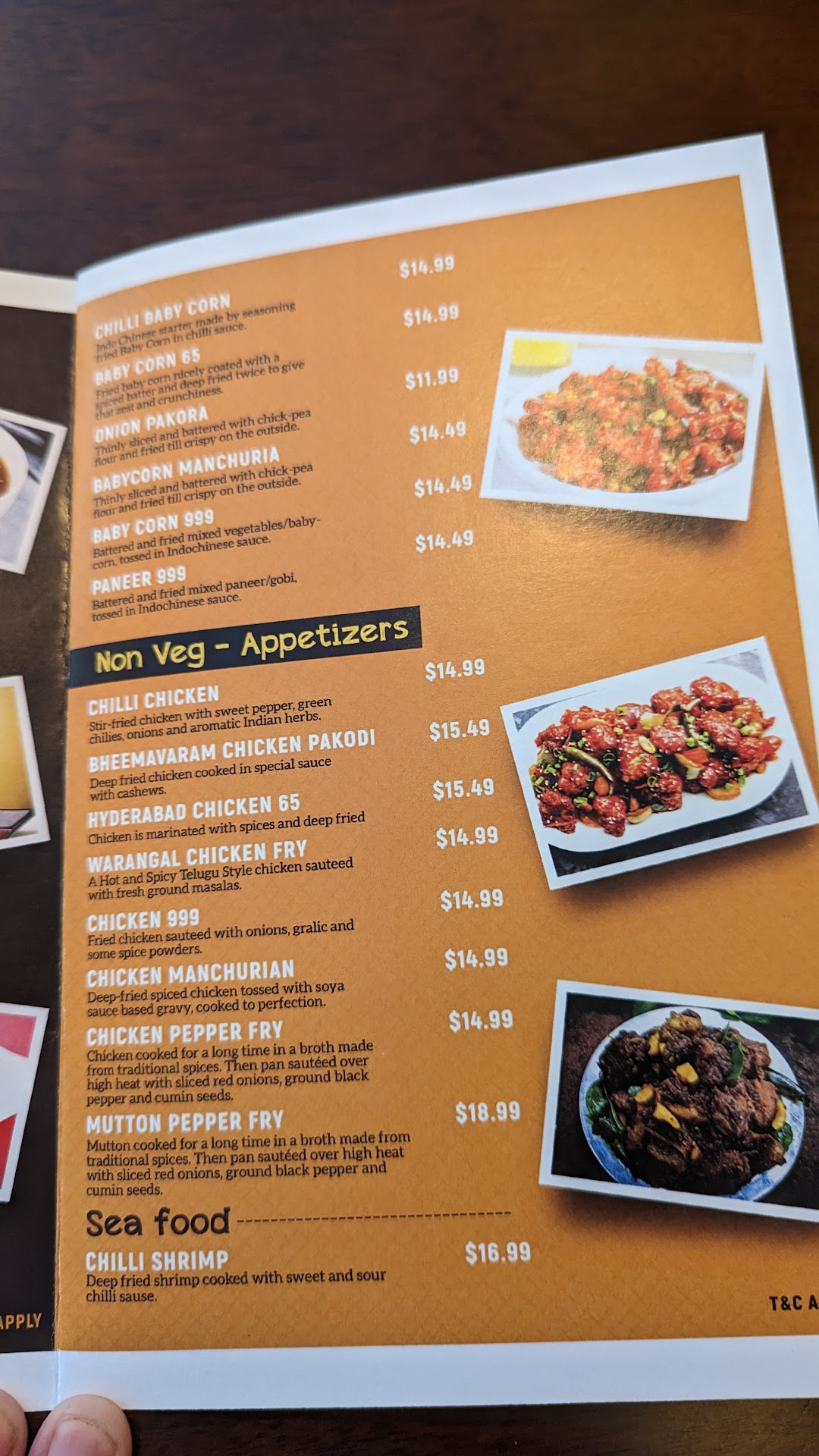 There were 3 of us, all super hungry and food usually tastes better the hungrier I am but it was not good. Our Pakora tasted burnt, the Bagara baigan had ok flavor but tasted a little off, so much so that after 4 bites I gave up on it, half of the naan was ok but the other half was underdone and doughy, and we ordered the bezawada fried rice that came completely different than advertised on the menu . We had discussed when ordering that we cannot have cheese and there was no paneer in the description and the waiter assured us no cheese but we found breaded and fried paneer with other breaded and fried veggies in a much to spicy sauce inside the fried rice (if you look at the menu it isn’t advertised that way and the veggies used were not what was listed on the menu). And it was so spicy none of us could eat it. We each only had about 3 or 4 bites before all our faces melted off. I usually have no issue eating 5 star spicy, but I’ve never in my life eaten any Indian food that spicy before, and my guests all agreed. Our lips and gums were still stinging an hour later. It went into the garbage when we got home. And the chicken curry dish my aunt had she said was edible but not good, she’s from out of town and is a traveler, and Indian food is her favorite, gets it often everywhere she goes and had said this was the most disappointing Indian restaurant yet.