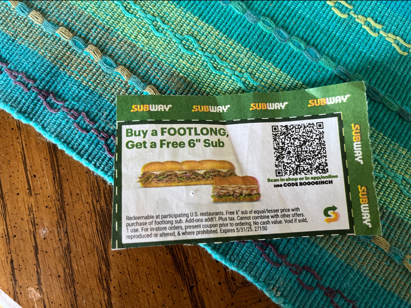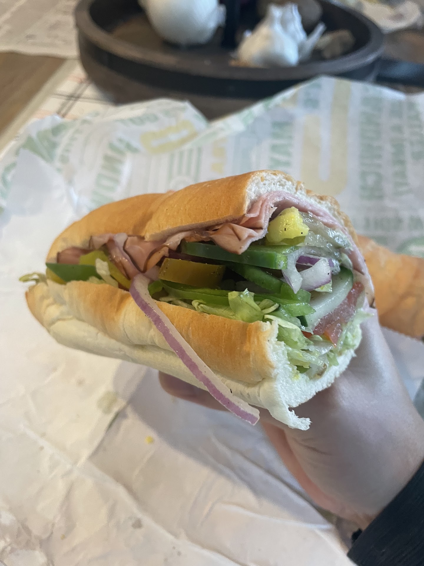 I was told that it is not possible to toast a sandwich using flatbread. Either this has changed since the last time I was there or, again, incompetency abounds. I asked for marinara as a spread not like a pasta or pizza. The guy slathered it on like he was making spaghetti. He forgot the bacon add and during the veggie phase, they were shockingly stingy. Default was 3 tomatoes, 4 pickles, 4 cucumber slices, and 3 tiny pieces of green pepper. None of that even covered the footlong. Wtfo!? Asking for more adds an extra piece. Maybe ok for reasonable sized tomato slices but green pepper bits? Come on!