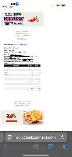 Read moreThis is by far the worst Chili’s I’ve been to! Let’s start with walking in the door, the manager was on her cell phone at the host stand having a conversation and did not acknowledge us coming in. So we go to the bar and seat ourselves at 2:00pm on 10/18/23. After sitting her for 3 minutes the bartender comes back and walks right past us and proceeds to attend to her other customers while telling them she is off work after they leave and refuses to service us. She along with a co-worker continues to walk past with no acknowledgment to us. I then asked her if there would be anyone to service us she looked at me and said “yeah they will be here soon”, so I asked her could we at least have menus. She said of course after she ignored us for 10 minutes. After sitting for a few more minutes I flagged the manager to come over and asked her if someone was serving the bar she asked if anyone had acknowledged us we told her no, we even told her she had not done so either. She looked at us like we were crazy and asked when did we walk in so we told her when she was on the phone in the front and she said oh ok instead of apologizing. She told us she would be back and at 2:15pm she walked over to us to take our order and gave us a glass of water. The bartender walked in shortly after greeted us as she was clocking in and asked how we were doing. This moment was a sigh of relief because every interaction prior to this was very disappointing.. I appreciate Kymara for coming to work as if she did not hate the place she was very attentive and inviting she apologized for our experience and let us know that she would turn it around for us so I thank her so much! That is how you show customer service. They did forget our...