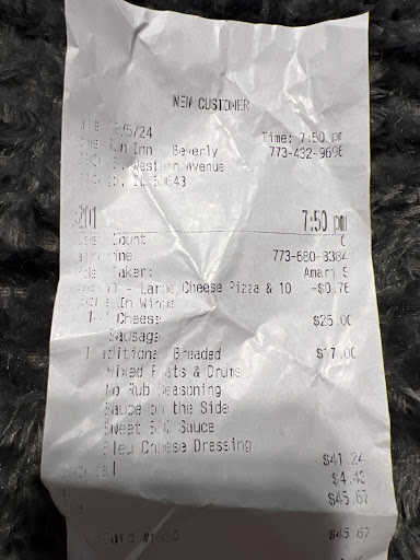 Read moreI placed an order for pickup at about 7:50 pm on 9/5/24 at the Beverly location in Chicago. My order was for a large sausage and cheese pizza and the 10 piece wing with bbq sauce on the side and blue cheese dressing. My bill came to about $46. Not a problem for me as I had a taste for Home Run Inn, one of Chicago’s favorite pizza spots (at least it was when I was growing up). When I went to pick up my pizza the young lady, I believe her name was Amari S, was very kind showing me my order and asking me how everything looked. I was ok with the look of my order and had no complaints even though it appeared that the pizza only had about 16 pieces of sausage on the entire pizza. When I got home and tried the wings they were basic and edible but really nothing to brag about. When I opened the pizza, everyone in the household grabbed a piece. As I picked up my piece, I noticed that the sauce was extremely skimpy to nonexistent, but I still gave it a try. When I finally bit into one of the family style cut slices, the pizza was beyond dry and I nearly went into a hypertensive coma from all of the salt (seasoning) on the pizza. I asked other household members and they also agreed that the pizza was mad salty. Whoever the cook was on that evening was clearly light on the sausage and sauce and HEAVY on the seasonings. Needless to say, no one else wanted any more (not even the dog) and it ended up in the trash. In this situation I changed my mind on where to order from due to me having the desire to have the HRI that I grew up on and loved. Unfortunately, the experience I got was not the experience that I desired. I was very disappointed and regret ordering from this establishment and will more than likely keep my future business with...