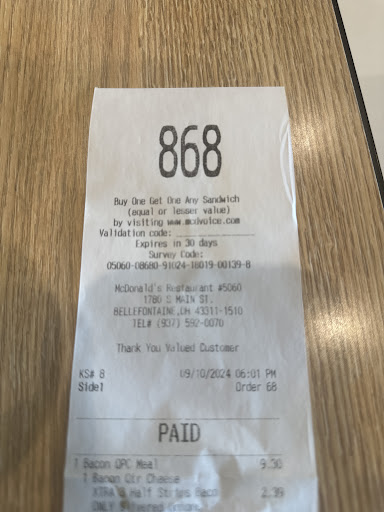 Read moreAttempted to place mobile order of bigmac, qtr pounder, cheeseburger, diet coke. Order was submitted to wrong store (south)so had to drive 10 minutes back to other side of town as I went the North store. Got to other store pulled into space 4. Hit " im here "on the app. app said error go inside due to error. Walked in cold & flurries to find the door locked. Walked around to other side of building still on windy /cold /flurries to find that door also locked. Googled phone number as there was no number on the error message in the app as it said to go inside the store. Called store. Male worker answered. I said I was outside and could see him talking to me and he said sorry ma'am the lobby is closed. I said yes I see you talking to me I'm calling due to error on mobile order that told me to come inside. He asked for my name and found my order...by now its been 1/2hr since I put in my order. He said yes I see your order go back to your car and we will bring it right out. 11 minutes later got burnt food now almost 50 minutes since I wanted "fast food" using the "fast easy " app! ....... I will not be returning to either Bellefontaine location. Google made me choose 1 star I didn't want to...