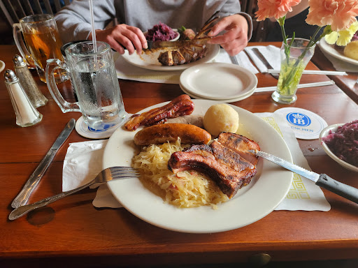 Read moreMy wife arrived a little early for our reservation, but were seated promptly. They were out of the beer that we really wanted (Köstritzer Schwarzbier), so my wife ordered a German Apfel Martini and I ordered a Erdinger Dunkel bier. My beer was 5 months expired from the best used date listed on the label, but decided that it was cold and didn't taste too bad so I decided to keep it. I lost my taste for it about 1/2 way through and it went flat quickly, but that was OK since I wasn't there to drink a gallon of beer. The wife loved her martini. We ordered appetizers (Reibekuchen served with applesauce and sour cream. And the NĂŒrnberger RostbratwĂŒrstchen served with 2 mustards and german potato salad). All of the appetizers were delicious. The potato pancakes were also very good, but were more like puffy hashbrowns without the typical spices and thinner crunchy pancake I am used to when I have these at Christmas markets in Germany. I ordered a side of SpĂ€tzle with cheese which arrived between the appetizer and the main course, really only a couple of minutes before as all of the food came out very fast. The spĂ€tzle was ok and the dish tasted more like a mac-n-cheese, but not really too authentic (I think maybe they use water instead of milk in their dough, but I could be wrong). The main courses ordered were Rindergulasch Mit Nudeln and The Farmer's Feast. My wife loved the Goulash after picking out the mushrooms that are not a traditional ingredient for this dish and weren't mentioned on the menu. I tried some and found the sauce too bland. The Farmer's Feast had 4 meats: roast pork, smoked pork chop, bratwĂŒrst & double-smoked bacon. The smoked chop fell off the bone and was tender, juicy and delicious. The bratwĂŒrst and bacon were also very good. The roast pork reminded me of my mom's home cooking (way overcooked, dry and not edible). The Farmer's Feast was also served with mashed potatoes, sauerkraut & red cabbage. I was very full from all of the different food we were eating, so in being picky, the kraut and cabbage seemed mushy and not so fresh and the potatoes could have really used some pork gravy in the middle of the mash. But wait, that's not all! We actually had dessert. My wife ordered the Apple Strudel and said it was excellent (I was too full to try that one). I ordered the Williams pear schnapps which they were out of, but the server suggested trying a fig schnapps instead and it was actually very good. The service never left us waiting too long and the bus staff was very prompt at clearing dishes that we were finished with. I am only knocking off 1 star for the expired beer and the dry roast pork. Overall we really liked the food and the service. We will definitely return very soon to...