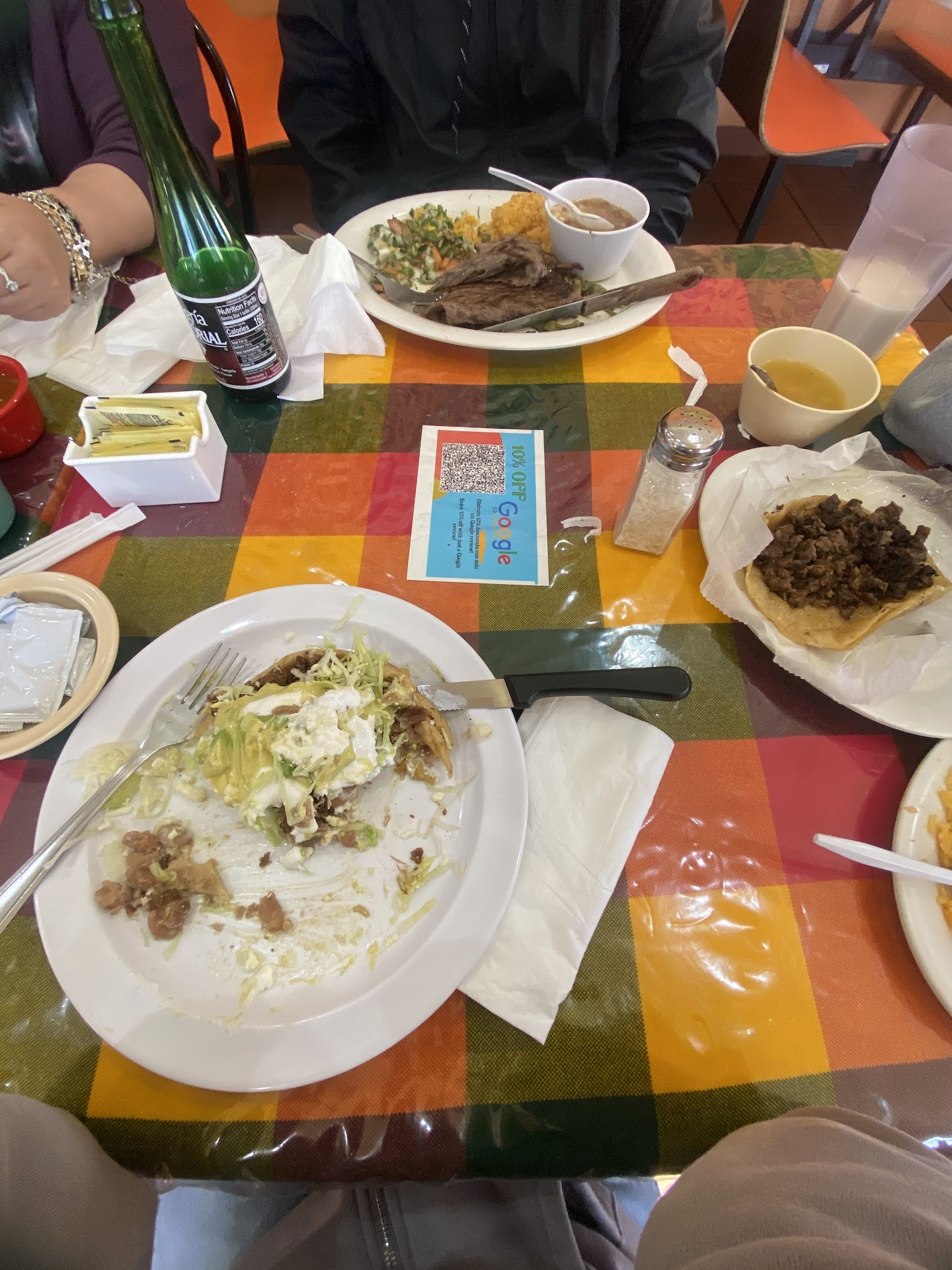 Love the atmosphere! The ladies are lovely they take care of you soon as you walk through the door. Sopes are a pretty decent size for one person . All of the plates we got were pretty big ! Asada tacos were very flavorful. The arroz was a bit salty but honestly still good. They serve you chips and salsa , and a tiny bowl of soup to get you started. It was a nice day here very full didn’t even finish all my food so I get to take it home for later..