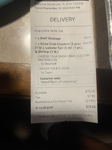 Ordered my meal , was told to wait 15 it took 30 . I spent $100 and all my food was not there. I called , they said they apologized and would have it ready when I come . I called 15 mins before so it could be ready when I got there . I got there the man made me wait until he served the people in line. He took several orders while knowing I was waiting for a mess up order. When he finally asked what the problem was with my meal, he said I was lying . Kept talking me to hold on until my mother and brother came in . Then he proceeded to pretend to be professional . He gave me my food a few mins later and Told me to dig through the food that I had eaten and see if the shrimp were there when I get home . Like why do I have to spend gas money and time on Motherâs Day . I will never g there again. There are plenty of other seafood junctions closer...