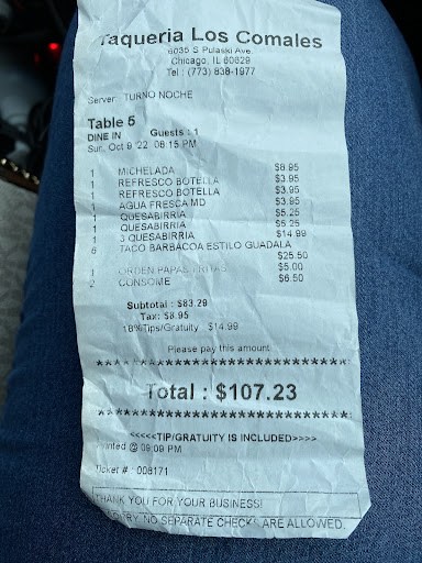 I rounded up the charge and I actually paid $6.25 for each taco, mind you I had already left a tip at the table and los Comales is supposed to be a fast food taco restaurant.