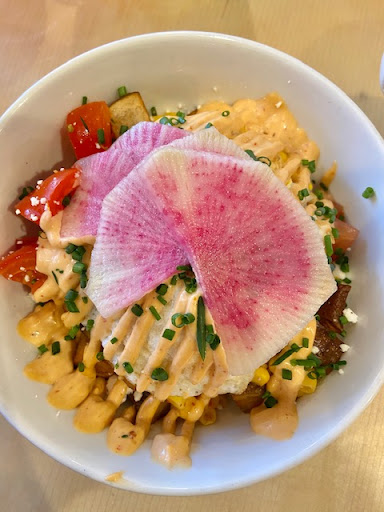 My friend had the Shakshouka Heirloom Oat Bowl. I was instantly jealous. The oat/grain base was hearty and flavorful, topped with all sorts of goodies like avocado, a hard boiled egg and the shakshouka which I believe was the spicy red salsa like substance that soon dominated the whole mix. I had potatoes on the side of my biscuit sandwich instead of salad and dipped it in the mix, and it was amazing.