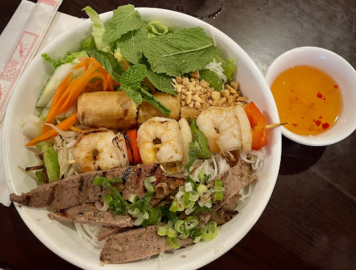 I ordered the Vermicelli Noodle Salad Bowl with Grilled Shrimp and Beef, a classic dish that usually hits the spot for me. Overall, it was appreciably light and refreshing for a hot day, but I would try to choose something else if I come again in the future. I wasnât too impressed with the meatsâ the shrimp and beef were both pretty overcooked and tough. The vermicelli noodles itself were goodâ they were light and chewy, though I wish there was more sauce to go with it. The veggies tasted fresh, and the peanuts and egg roll added a nice, crispy texture to the bowl.