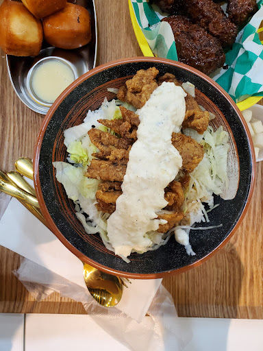 Passed by this place and had to try it out. Ordered a chicken rice bowl, honey butter wings, and fried buns. My friends ordered the Korean veggie bowl and another chicken bowl. (They don't have a big selection for vegetarians, but it is a chicken place so it's good they still have a few.)