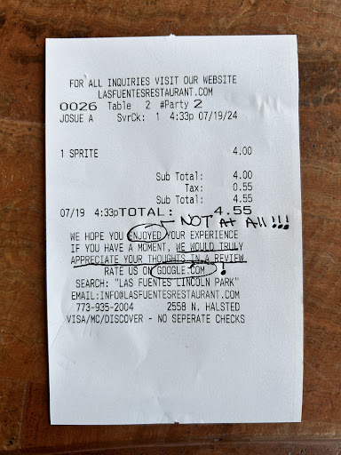 In light of these unfortunate events, I am compelled to refrain from recommending Las Fuentes restaurant to others and to divert my patronage to businesses that prioritize customer satisfaction. I hope that this feedback will prompt the necessary improvements within the establishment.