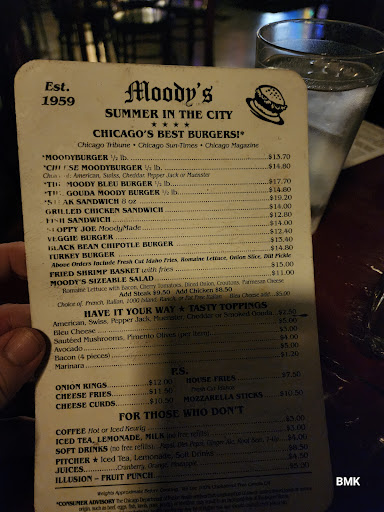 6/2024:We've been coming to Moody's for years, many many times per year with our whole family; and this is the first time we did not have a good experience. This mainly was due to service, then food quality, then atmosphere. First off our table was so sticky that I couldn't even get the menu off of it until the 8th time digging my nail under to peel it off the table. Everyone was on their cell phones that even my 9 year old commented "the only person working in this place is the cook, i feel bad for him". Part of our order came out bad so they attempted to fix it which took 15 mins to get just another patty. Honestly the 2nd patty was more juicy and better cooked than the first one. Our waitress took too long to bring waters & utensils to our table. Mind you this is 5pm on Saturday and only maybe 6 tables of customers not busy for what we typically see when we come here. Then we got overcharged not once but twice i kept checking over the bill. I voiced the issues to the waitress and "manager" but nothing got corrected and they both claim they are good at their jobs. I hope they learn how to do their jobs better because as a frequent customer I was displeased. *From 10 months ago: Never had a bad time or meal at Moody's. We bring our family mainly during the summer for burgers and to sit outside in the courtyard nut also enjoy their delicious burgers during the winter indoors as well. Such an...