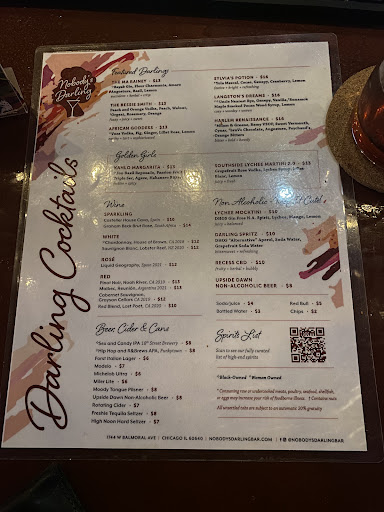 It Could've Been Better. I Heard Such Great things About This Place. And Then When We Went.. The First Drinks were Very bland and unsavory (we Ordered Traditional Cuban Mojitos) they Were Saturated With mint Leaves, No taste of Bacardi Rum which it Calls for(she added Some other off Brand rum)...and It had alot of Seltzer water. So My Friend Turned those Drinks back in...and We ordered two of their "Mezcal Old Fashioned". Those Drinks were just a little Better...NOT Great. I forgot The bartenders name(she wore glasses) that served US...she was Nice but Her Drinks Weren't Good at ALL. I couldn't Smoke...although We Were OUTSIDE. The female (brown skinned with a Clean cut) Cleaning up... Came Outside to "Specifically" Tell me To NOT smoke Outside. I just Lost My Son..a couple Days Prior. I Was Coping and I Was Trying Out the Atmosphere of "Nobody's Darling". I Am An OUT Lesbian with Grand Confidence and Swag. I've BEEN Wanting to check this Place Out For Months. I mainly live Out South in Hyde Park Area...and Also Hold an Condo in Evanston Area. I purposely...Brought a Friend With Me..so She Too Can Check this Much Raved About Place. Sadly, It Was a Bad Experience. Oh yeh, the Nice Bartender CAME outside To TELL US to pay for Our Drinks (even though We had an open tab).. although we were NOT done with our drinks. I Would've Probably order a 2nd Round. But, Since She thought or the female (who was sitting w/friends Outside when We Pulled UP) who Brought Our drinks Out To US told her to Go Tell Them to PAY for these drinks. You guys May have Thought We Were going somewhere. WE Weren't. Very Unwelcoming. Next Time Give people A chance To BE COMFORTABLE. You're To Edgy. I READ the ROOM VERY WELL