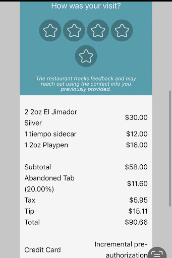 First, we forgot to close our tab, and were hit with a 20% “abandoned tab fee” on TOP of a 20% tip which was calculated after the fee. So our $58 drink total became $90. Then we were charged $48—for an entirely separate order after we had already left. Over the next few days, my card was charged four times: $30, $45, $90, and $30.
