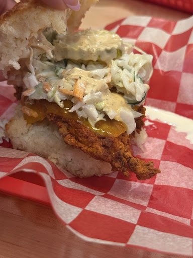 The food wasnāt underwhelming but it was nothing to write home about either. It all was just okay. Two friends ordered the heater, one was on a biscuit the other one was served on a brioche roll. I got BYO with Nashville Hot, pickles, coleslaw and cheddar cheese. Also on the table where green beans, Mac and cheese, chocolate chip bread pudding and peach cobbler. The Heater was spicy initially then after a few bites the heat was gone and all the flavors melted together instead of playing off of one another. A friend said the biscuit wasnāt flaky but doughy with a tough exterior. My Nashville got sandwich was meh. The bun were cold as well as the cheese. The coleslaw was watery and the chicken was not that spicy. The Mac and cheese was the best part of the meal. Iāve never had spectacular Mac and cheese at a restaurant but this one was decent. The bread pudding was dense, all you can taste were the chocolate chips. None of us wanted to finish it thought the peach cobbler was delicious. The topping was more spongy than Iām use to but it was damn good.