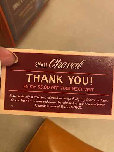 Read moreThis was my first time having Small Cheval. I got a double cheeseburger which was delightful. I thought it was well cooked and had a good flavor. I also ordered a side of fries which were crisp and hot and paired well with the garlic aioli I was offered. My only complaint about the food is that the garlic aioli cups are not larger because that was my favorite part of the meal. The vanilla shake I ordered was rich and creamy. The service was great. The food was good. However, the seating in this place is incredibly limited. The restaurant was very busy and only has maybe 10 seats and a small standing bar. I think there’s enough space to create some more seating options for dine in customers, but I’m no interior designer or business owner. Overall, I enjoyed my food but wished there were more places to sit as we walked 25 minutes to get there and didn’t want our food to get cold on...