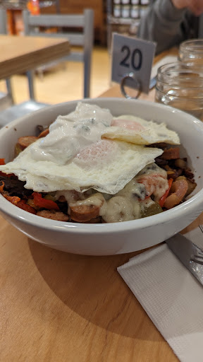 Read moreI ordered the Hash with chicken sausage, listed as $13.95 on the menu. It came with roasted local potatoes, red onion, mushroom, peppers, red barn heritage white cheddar cheese, two over-easy organic cage-free eggs, and scallion sour cream.