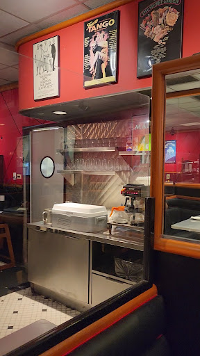 Tastefully decorated in red and black with wood trim throughout, and metal table tops; Feels as if one was dropped on a movie set; (perhaps, Back to the Future?)