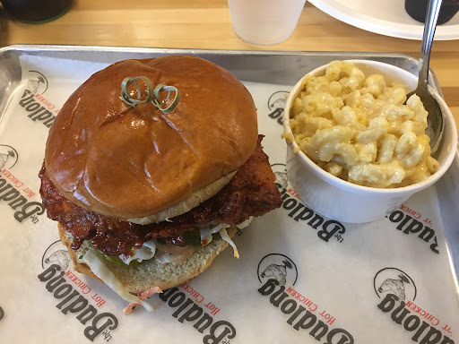The creation of the budlong was a great idea the Nashville hot is very delicious when done correctly. There is many issues with this concept of putting a spin on something while saying it is what that exact same thing. From New Orleans gumbo and crab boils to Memphis ribs. The minute a spin is put on it then it is not that such thing. Budlongs whether it is this location or all it presentation is great the flavor is not. The chicken even when it isn’t spicy is very bland. The chicken itself nor the batter was seasoned and I had the neutral chicken. Thinking my fiancé chicken would taste better because she had the hot version was not the case it was just hot bland chicken. Second we also had the Mac and cheese. This idea of Mac and cheese was just a lot of cheese with very little thought of Mac and cheese with good filling just noodles and cheese. We also had the collard greens at first I was giving good chops to the flavor but it seems the recipes just called for vinegar and boil the greens and call it collard. Then there was the banana pudding, it should have been called pudding with bananas in it. The whole idea was of budlong was the creator went to Nashville liked the chicken so much that he came back and spent a year creating a recipe and boom the chain came to be, well he fell very short of the Nashville taste. Places like these that want to give you a taste of a certain food from another area fall short consistently because they want to tweak it yet it taste worse than ever. One last fact we ordered a salad and didn’t want the chicken on there and they said the only way we can get the salad was we have to order it with the chicken on there we asked is this a premade salad they said no we said well don’t put the chicken on there which they have to cook they said we can’t do that we said we will pay the price of the salad with chicken on it just don’t put chicken on it they still couldn’t understand don’t put chicken on it so we bought the salad had to take the chicken off ourselves. Basically this place was terrible I took the chicken home and then seasoned it again with the Popeyes...