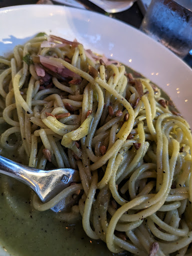 Again when we were (finally - over an hour after our arrival) served the "Spaghetti Alla Chitarra al Pesto" was not the "hand-rolled ramp pasta" listed on the menu. It was very average machine produced spaghetti. It was over-sauced and the pesto was very watery. The past was properly cooked and the dish was well seasoned - and hot, so the timing issues weren't with running the food or one dish waiting on another.