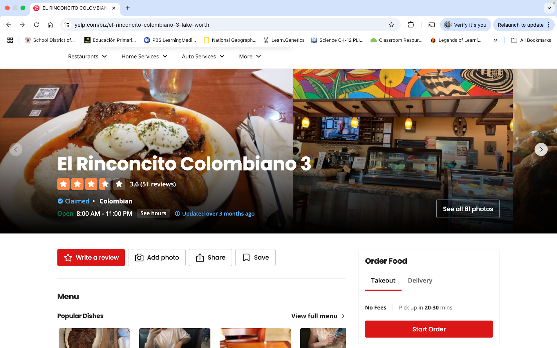 Read moreI've been in this restaurant several times, always bringing friends and family, they are always on top of the game, and the food it's delicious and tastes the same as if you are in Colombia, but last time I went I ordered as an appetizer "empanadas" and they didn't taste like they always do, so I told the waitress about it and she told me: I can't take the plate with me, you have to take them with you or something... and I was shocked about that, I asked her if I could talk to a manager and then she comes (the manager) and tells me the same... we can't take the food... that I had to take it with me but they can't take it from the table; I told her: I don't like the taste of it... I don't want to eat that.... she said: the best I can do for you is ask the cook if he thinks the food is good, I told myself: the cook is not paying for my food. I AM... she came back and said: cook says food is fine... we can not take it. I want to let someone know that to my eyes this is a stupid rule... and if the wanna keep it, then they have just lost my business and absolutely every single person that I...
