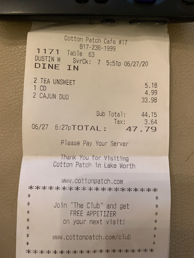 Read moreOn June 27th, we were traveling from Springtown back to Fort Worth. We stopped at Boo Rays for seafood in Lakeworth. There was a notice on the door about an employee with covid and they were closed. We immediately decided we wanted the Cajun Duo and looked for the closest Cotton Patch. We arrived at the restaurant and proceeded to enter. There were signs on the door stating the new county ordinance requiring face masks, so we wore ours in. As the host seated us, I noticed 4 servers in the expo area near the kitchen, hanging out, with face masks on, but around their necks. I asked the host why we were required to wear face masks but they weren’t? He asked whose not wearing and I pointed towards the servers. He went over, stood next to them and kept looking towards the kitchen. Our sever Dustin greeted us after several minutes. He got our drink and food order. 2 unsweetened teas, 1 with lemon, 1 chicken/ dumpling soup with pepper and 2 Cajun duo’s. We got 2 teas with lemon. Soup came out with no pepper. He came back to refill my wife’s tea. Since this was his 3rd visit to my table with his mask covering his beard but not his mouth, I asked him why we were required to wear masks into the restaurant to cover our mouths, but he wasn’t required while working inside. He said “Honestly, nobody’s told me to!” Then he walked away. We still had not received any rolls at this point, so my wife stopped another server and asked for some. When she brought them, we tipped her a couple dollars. The next 2 times our server Dustin returned to our table (after my statement,) he put his mask on correctly before approaching, spoke to us with attitude, then would lower the mask below his mouth, covering only his beard and chin as he walked away. We did notice a party of 7 being seated next to us and no one said anything to them about not wearing a mask when they entered or walked through the dining area. When we were ready to go and couldn’t find our server. We flagged down the other server again, asked for a to-go box and tipped her again when she brought it. THE CAJUN DUO WAS THE BEST WE’D EVER HAD! But, the portions were quite a bit smaller than we get from cotton patch in Watauga. There’s always been enough left over for a second meal, until this time. The 2 stars are for the food, as the taste and flavor WERE GREAT! The service and experience will keep us from visiting this restaurant again!