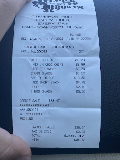 I tried to hold off on doing this, but after 3 times of dealing with this place...and even speaking to Ginger herself, who said she would send us some coupons/vouchers for the service I received (then never sent them). It's time to leave a review. Look, I wanna love this place, because the first meal we ordered from them was amazing. However, every time we order from there there is an issue or an incident. I have ordered Take Out everytime with this place...and everytime they have forgotten the Cinnamon Rolls. Not usually a problem, because I always check the order before I leave anyplace...the issue is the attitude of the woman who is always at the cash register. I inform her that there are no Cinnamon rolls in my bag, and she acts as if I have gravely inconvenienced her because she didn't ensure my order was correct. One time she said they were out of cinnamon rolls and would have to refund the money...they weren't out. Someone from the back ran out to tell her my cinnamon rolls were still in the oven, she never even checked, nor cared to check. This woman has possibly the worst attitude and frankly I have no idea who thought having her run the register was a good idea. She is rude, huffs and puffs at everything, and doesn't ask if you want to leave a tip, but effectively demands it. I can say more about her, but I already told Ginger about it and nothing was ever done. The food, though great at first...began a steady and constant decline. Our main food orders went from correct and delicious to always wrong and edible. I am thoroughly displeased with Ginger Browns. They use to be a delicious escape from IHOP and Denny's...now I'd rather...