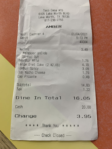 Read moreIt's Taco Casa... It gets 5 stars! I usually always only order a chilada or a regular tostada, because they pile on the toppings for their tostadas and filling for the chilada, so that's plenty to fill me up. But every once in a blue moon, you'll get your order and it'll be a one-offer, meaning it just isn't up to your expectations. But only because they set the standard high to begin with. This visit's chilada was spot on, and I'm glad it was, because the tostada left much to be desired, I'm afraid. The beans were smeared on half the shell, and the lettuce and cheese was so scarce I thought I was eating bean and chip nachos. Seriously. I could've gotten a much more appealing one from that other taco place @the border. And the kicker, which I just laughed and smh, was that they still used two shells! đ Which, is normal for the way they're normally made. So, yeah, they fell short this time. But, I'll be back. I know it's not a regular reoccurring thing. The restaurant is usually always clean, restrooms clean, stocked up on plastic ware, napkins, and what-not. The staff is always top notch, with big smiles and welcoming "hello"'s as you enter. Service is usually pretty quick inside, but can be a few minutes longer considering the crowd they have, and the drive through is usually always busy, but very efficient in getting you through in a timely manner.* *Evening & night time drive thru times can and usually are...