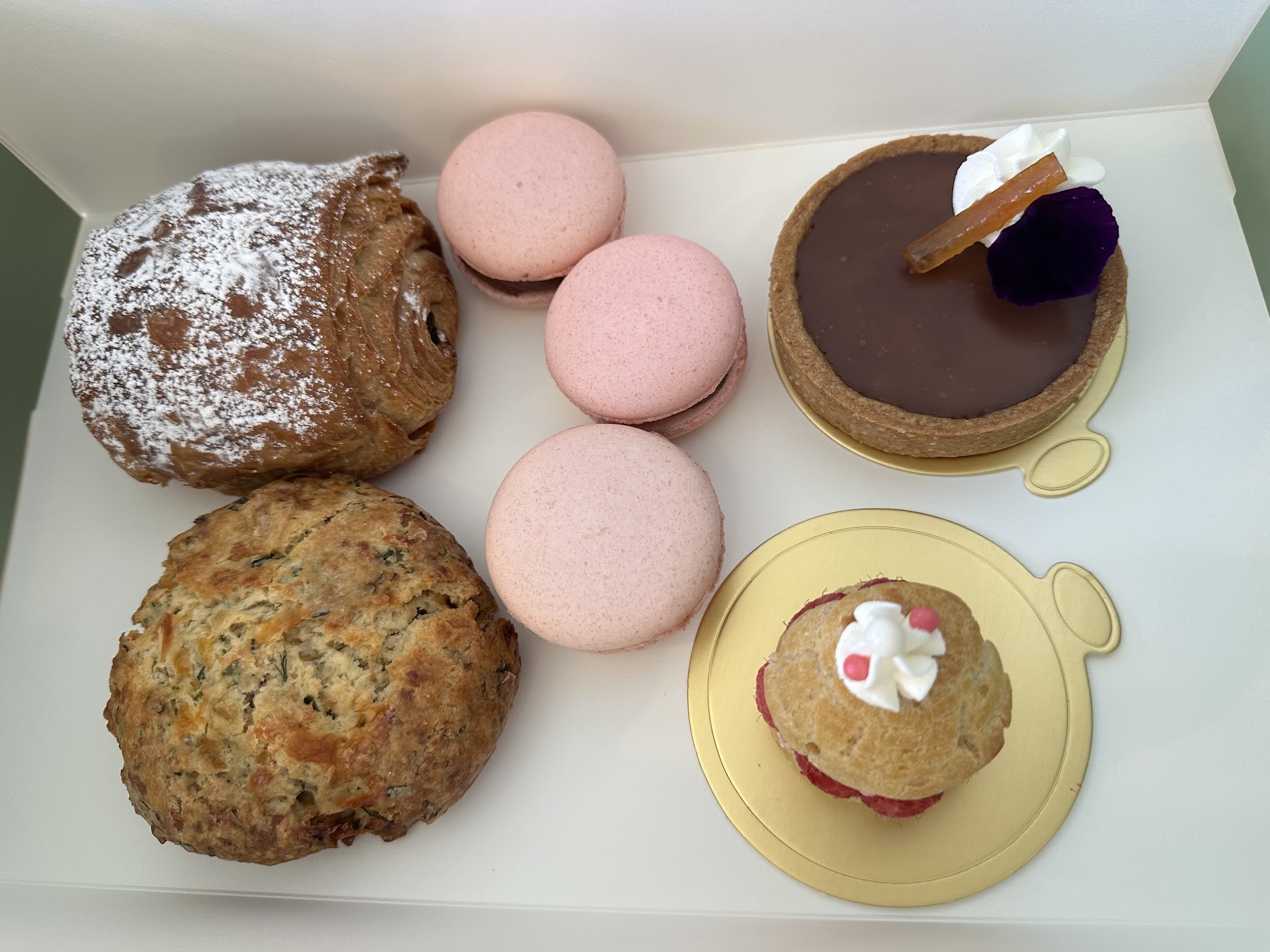 It was a bit pricey, yes, more than maybe some other local bakeries, but the quality made it make sense! I thought prices were very fair, personally. It was luxurious..? My toddler also enjoyed some shared sweets while we stopped in and it was just a nice little treat! The raspberries in the croquette were soo very fresh! The cream was light and airy. The macarons were light and crisp, filled with a slightly-chilled chocolate mousse and a hidden raspberry fruit-filling inside! The chocolate orange tart was rich and decadent. Luxurious. The chocolate croissant-just like a Parisian bakery, they were flaky and buttery and fresh and I will probably buy those every week routinely, regardless of the rest of the items I might also like to try there.
