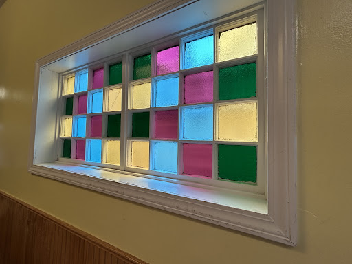 Best thing about this place is the multicolored glass window that I have conveniently included a photo of here to save...