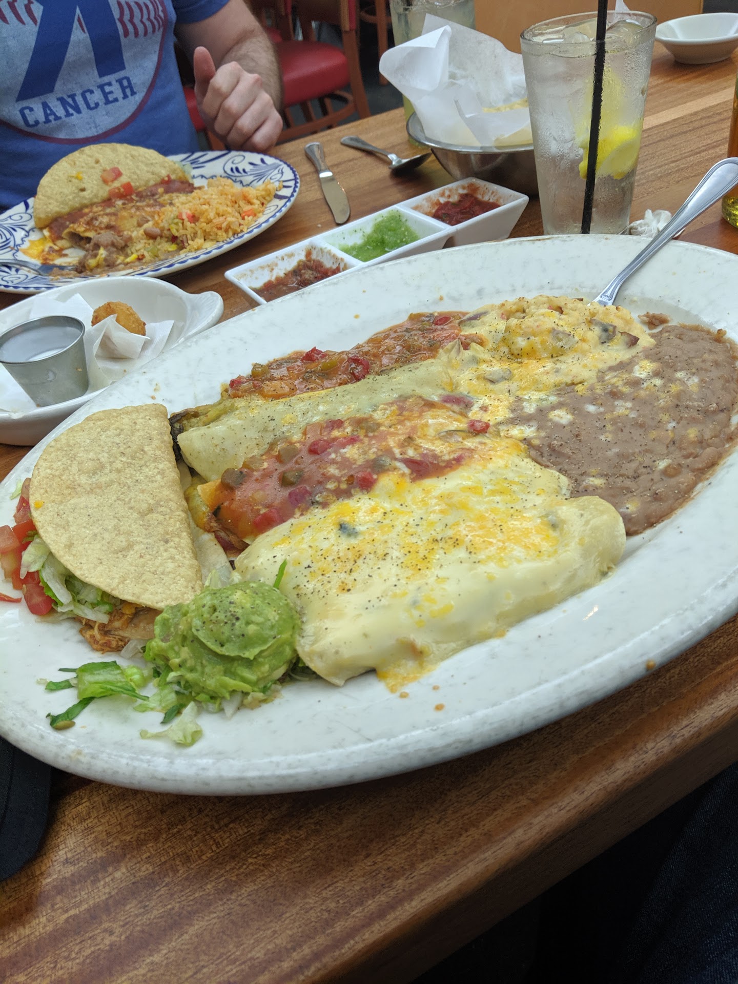 Read moreThe food was good not the best but not the worst either. The queso was bland and yellow instead of white and therefore reminded me of cheese food instead of handmade. The salsa however was handmade as it has a roasted taste with a very nice spice to it. The portion sizes were great for the meals and it has a great categorization on their menu for those who are vegetarian or are gluten sensitive. I had the pick 3 enchiladas and chose the cheese, guacamole, and the chicken and I was able to ask for lettuce wrapping them which was a nice touch compared with other Mexican restaurants. The cheese one however was bland, the guacamole had somewhat more flavor but the texture was strange as it needed more than just guacamole inside of it as it just oozed out, the chicken one was a great balance between texture and taste so the chicken is seasoned very well. The refried beans had a great taste that came with the meals but I never liked Spanish rice and the rice here was similar to others so I still didn't like it. My son loved his bean and cheese burrito and my mom loved the crispy tacos and said the refried beans were excellent. The service however was not the best the waitress was not coming to the table enough to make sure we had enough to drink and when she did come back she was rushing us to pay the bill. They don't put the hours of closing time on the doors either but people were coming in the door even when we were leaving but they were cleaning everything in the restaurant even though there were tons of people in the restaurant still. I couldn't even go to the bathroom as the moment they saw me going towards the women's room they moved the trashcan in front of the door and pulled the cleaning cart into it I asked if I could still use the restroom beforehand and the lady said no I am going...