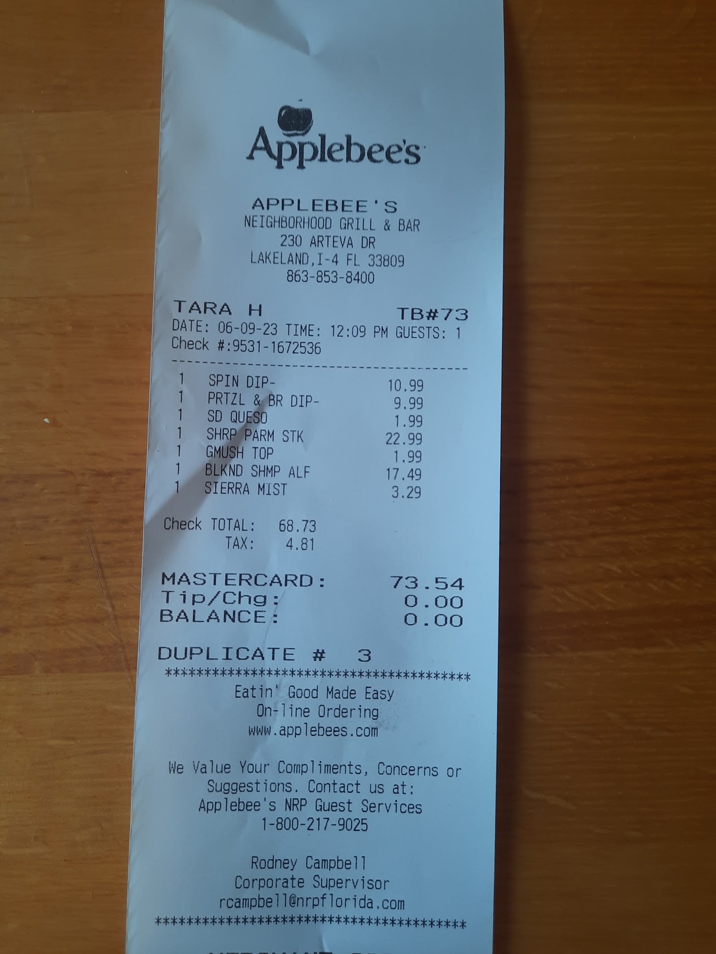 Ā Ā Ā Read moreOn Sunday my wife and I went out to eat on Sunday evening and decided to go to our local Applebees. To start, the service was probably the worst Iāve ever received. We were there for probably the better part of an hour and a half. Our first drink refill we received after asking was over an hour inā¦so much so that the cups were still full when they brought us a Togo cup. Our meals did not come out complete so we asked for a box to take our food home with. We were told by our waitress Brianna that we were not allowed to have a large to go container because those were for Togo customers. So we asked for a manager and thatās when we met AMBER. She was supposedly a manager, but told us in the end that she was āJust a Keyā. During our conversation she continued to treat us like we was guilty or like she had something personally wrong against our family. She had expressed the same idea that if we took a large to go box from them we would short them in the instance they needed it later that night for a Togo customerā¦LIKE HELLO!!! Our service was so bad that we are now to go customers. Well, Amber continued then to try to have us just take the plate with us, but followed it up with the whole ātake the plate, but Iām not sure what else will happenā as if she was trying to bait us into taking it so she could have me arrested. I was absolutely disgusted with the entire transaction between Brianna and Amber. We still paid for our entire order, but I will never go back! Amber at the north Lakeland Applebees has got to be the worst manager or ājust a keyā that Iāve ever metā¦in front of other customers just degrading other customers. Itās disgusting that you all employ such people in a industry that is struggling to get customers to come and spend our hard earned money. I thought with the unique story of how the CEO of your company got control of Applebeesā¦I was so amazed at what she did, how could I NOT support her?!?!? Wellā¦Amber and Brianna have completely messed...