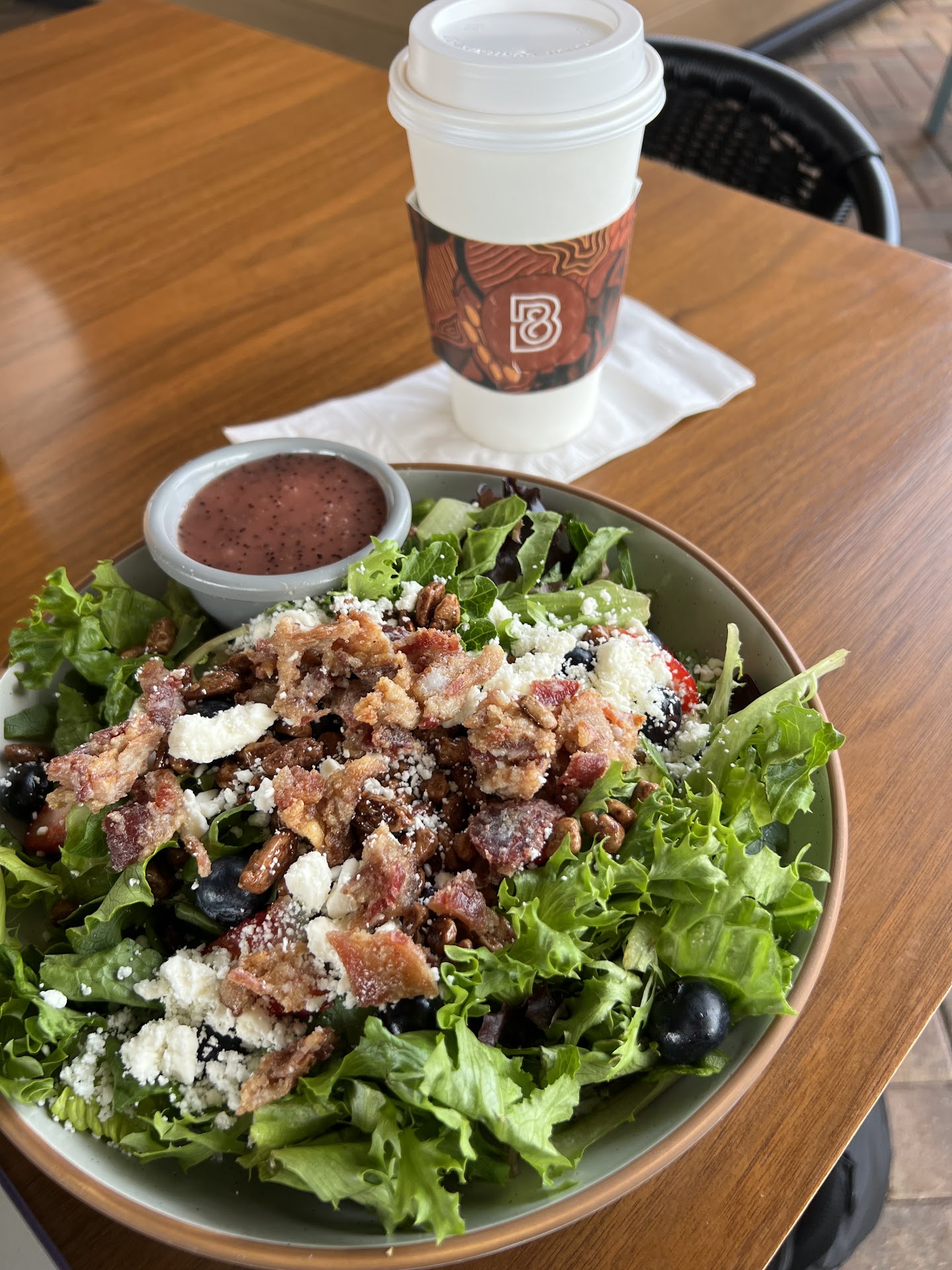 Compared to the downtown location, this one has a much, much more limited food menu. Like probably half of the normal menu. But this being said, the product is still just as good as you could hope for. A favorite of mine is the Strawberry Pecan salad- itâs incredible! They have some great paninis as well. And you canât really go wrong with any coffee there. The frappes are especially good and make Starbs look like a fool (itâs just the truth). Lastly, this location does also have wifi if you want to do work or homework- the downtown one does not have free wifi unfortunately.