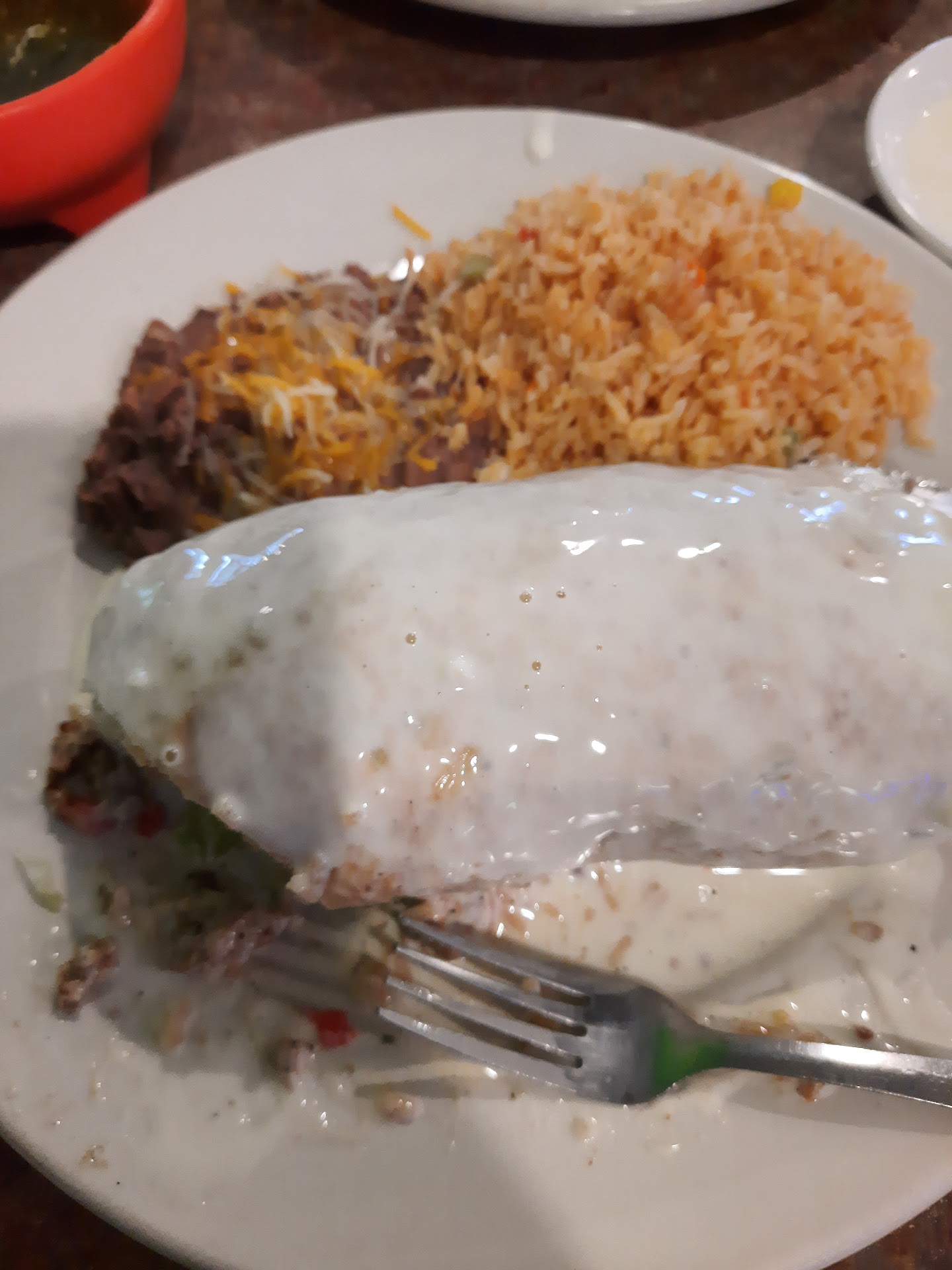 Ā Ā Ā Read moreWednesday at 130pm. Music was super loud. Tables were dirty. Coke in bottles, Styrofoam cups with ice, no lid nor straws. I think they should invest in fountain machine or get a better delivery company so they have soda on tap. Chips with green salsa type dip. Chips were cold and hard. Green salsa dip, a little spicy and strange. Ordered white queso for chips instead, but nothing could help those cold hard chips. They were out of steak so I ordered a chicken burrito with white queso, expected a light drizzle of it, but it was drowning in it. Huge portion though. Burrito was delicious so they got that right. Noticed a large black mold spot on the ceiling and mold spot on menu. This should have been cleaned or tile replaced. Price was good for...