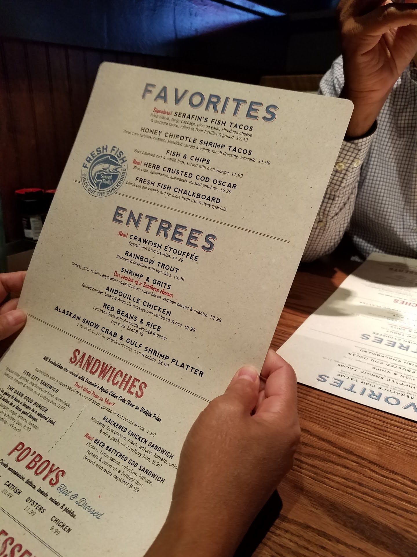 Read moreI had a party of 11, and I thought I had made the right choice bringing them to eat at Fish City Grill. Yes the staff is friendly and the food affordable, however, when a restaurant uses salad dressing to season their foods, that is not acceptable for these types of restaurants. You can expect that in a fast food place, however, here it shouldn't be allowed. All of us were surprised to see the limited many entries on the menu that was presented to us when we were seated, and when the waitress came to ask if we were ready to order, we asked why so few items, and she pointed our to the walls where more choices were hand written on paper. We found that in bad taste because we had to get up from our chairs to look around to find something interesting or exciting, which of course, when we got what we ordered, most dishes came with salad dressing for seasoning, and some with so little that, you couldn't tell. Additionally, I intentionally decided to order the the fish sanwich, and when I cut it to eat half, the bottom piece of breard was so wet that I couldn't eat it. It looked like if it had fallen into a water pot. Also, what happened with your water filtration that the water tastes like Clorox? I certainly did not drink it, and ordered bottle water. One last thing: My wife ordered a virgin Piña Colada, and that was not available. Maybe it will be a good idea to add these types of drinks for those like us whom don't drink alcohol. You will get the opportunity to earn 5 stars when you get to know if your staff is taking short cuts not following any SOPs you may have in place, or when you stop using salad dressing instead of spices to give taste to your foods. I wish I could have taken a picture of my sandwich so you could see how it looked like, but I was too embarrassed to do that with my group I took to your restaurant. I invite everyone reading these comments to try instead Asian, Italian, Indian "From India" Mexican, and all other tasty foods, then make the comparison with...