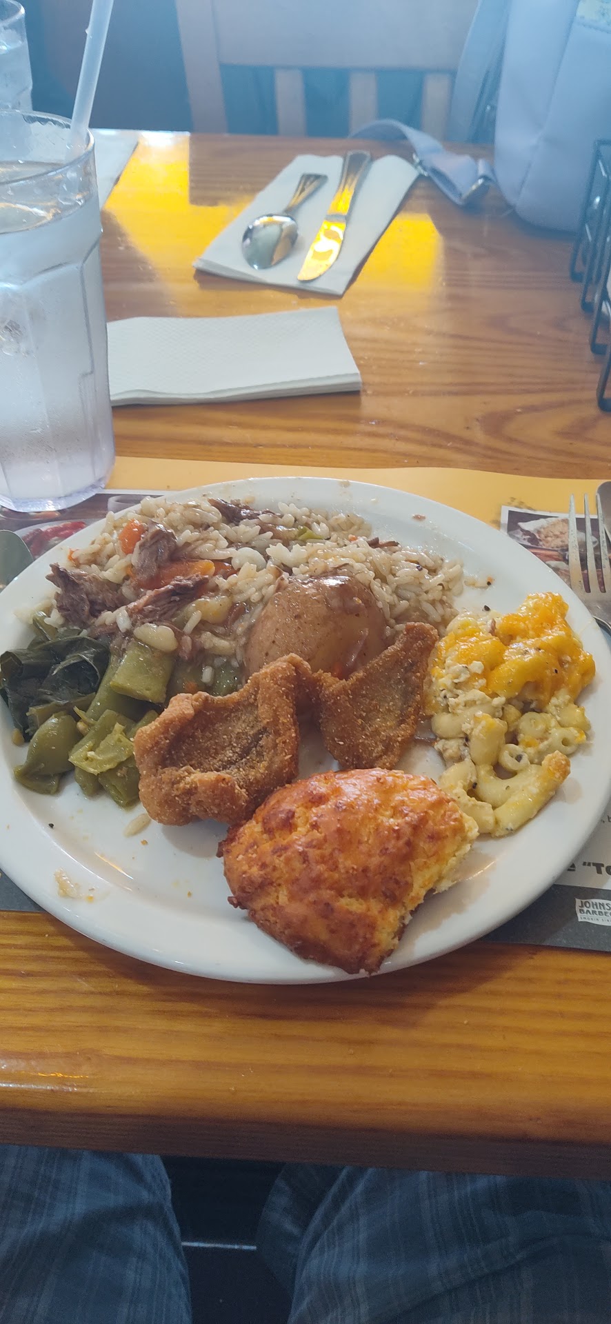 We drove from Orlando to Lakeland to experience this all you can eat buffet for $15.95 at Fred's Market Restaurant. We ate around 4pm, so well after the brunch menu had been removed and the lunch/dinner menu was being served. I was very impressed with the fried catfish nuggets which were fried to perfection in a cornmeal dredge. The mashed potatoes covered in brown gravy was super delicious, especially with the corn casserole as an added crunch. I had the smoked chicken thighs which was some of the best smoked chicken I have ever had. Perfect smoke ring, and oh so juicy. I had seconds on those as well as the regular fried chicken which was also fried to perfection and had a really nice seasoning both on the skin as well as the inside chicken. One of the juiciest fried chickens I have ever had the privilege of gobbling down. The Mac'n cheese was utterly flavorless however. It contained a great deal of cheese, but it was just very dull and had absolutely no seasoning to it. Really needed some salt or a saltier cheese to make it more palatable. The oh so soft hot buttered rolls were to die for and were the perfect accompaniment to the fried chicken and mashed potatoes covered in gravy. The cornbread biscuits were also quite good, but could have been a little more seasoned.