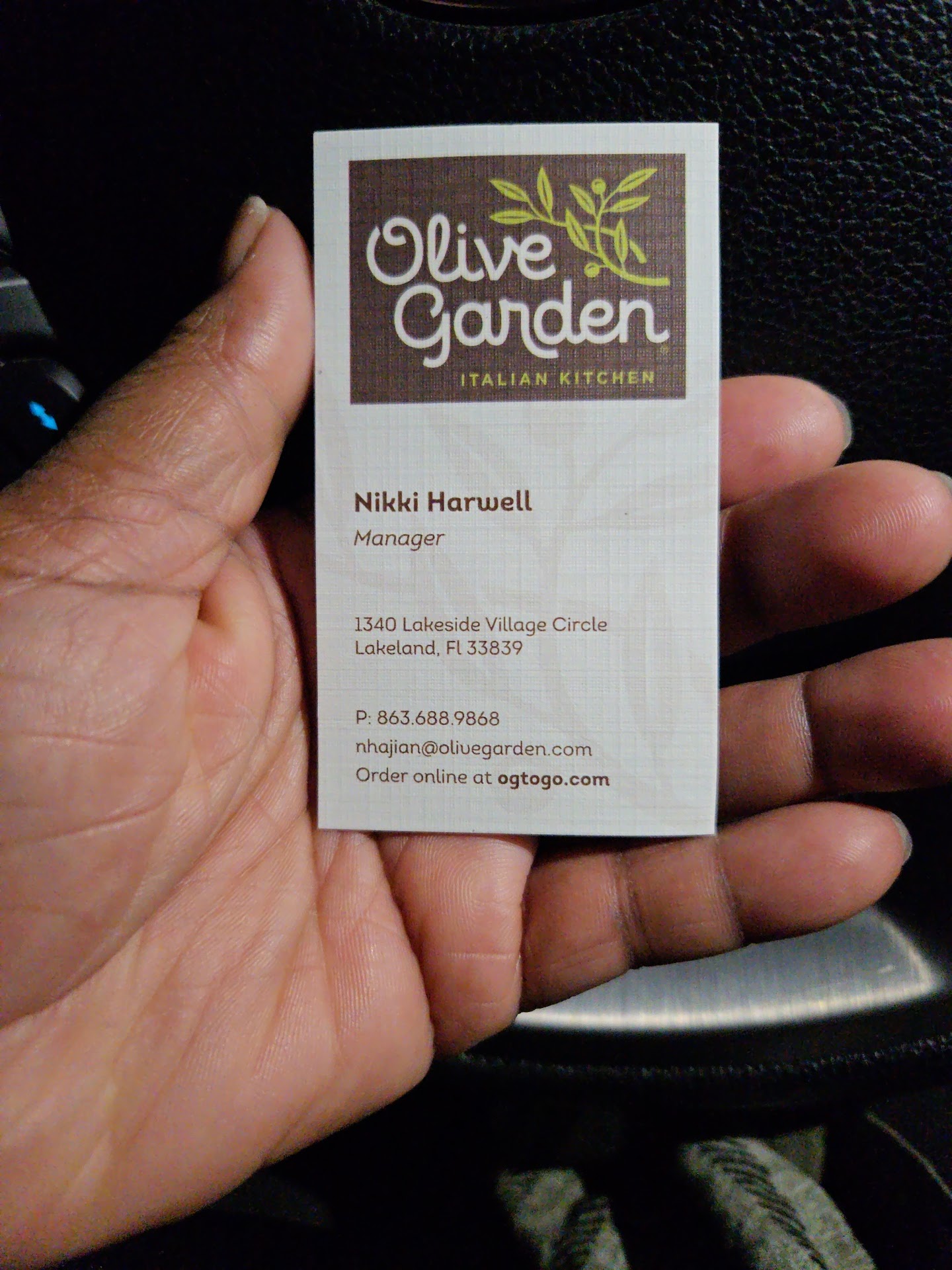 My husband and I had a dine in experience at this olive garden located at 1340 lakeside village circle in Lakeland. This is literally one of our favorite restaurant chains to eat out. The food was great, Michael was our server, and he was very attentive. We left happy. The problem was that right after I walked out of the door, I literally turned around and said to myself that I should use the restroom because I have an hour and a half drive to home. I knocked on the door with a continuous knock and watched the manager, who just told me to have a good night, look up at me, and then look down at what I was guessing was her phone. It wasn't until two other employees, one being Michael, came up to the front with her and heard my knock, that they all just looked and stared at me. After seeing this, my reaction then turned to anger because at this point, what are we doing?! So I threw my hands up and said out loud," what, Yall just gonna stand there and look at me?!" The manager came up to the first set of doors, with very obvious frustration, saying how she wasn't supposed to let me in. I responded that I literally just walked out the door from eating at this restaurant and I just needed to use the restroom before getting on with my long ride. She continued to stare at me through the glass now, while I guess she was thinking on whether she would let me in. I am a person of principles and of moral character. I respect policies and i tend to try not to break the rules. This lady had me ready to go upside her head! I was tight!! She finally let me in, but continued to have a very nasty face looking at me as I walked past her. I assertiveness asked Michael where the restroom was and went in and out within 3 minutes. Now I really do get that this lady, whose name is Nikki Harwell, the manager, was supposedly following policy, but she didn't even give me the benefit of the doubt on why I was standing out there. When I came from the bathroom, I asked her for her name and asked how I can leave a review. She told me that it is policy or something in that manner. I repeated my question asking how to leave a review and her name, then walked towards the door after she gave me her card. She says it loud as i walked away, that there was a sign on the door. Now I know my little review isn't going to make too much of a difference, but I felt it was necessary. There is a way you should treat people and a way you shouldn't. She didn't even give me the benefit of the doubt of maybe I left something important or anything. The sign also reads at the bottom that if you need help, to ask a manager. I don't know if this was a sign of racism and if I had been a white woman, things would've been different, but I definitely got a very nasty feeling from Nikki's vibe. I do hope she does better in the future with assisting people, being the manager...