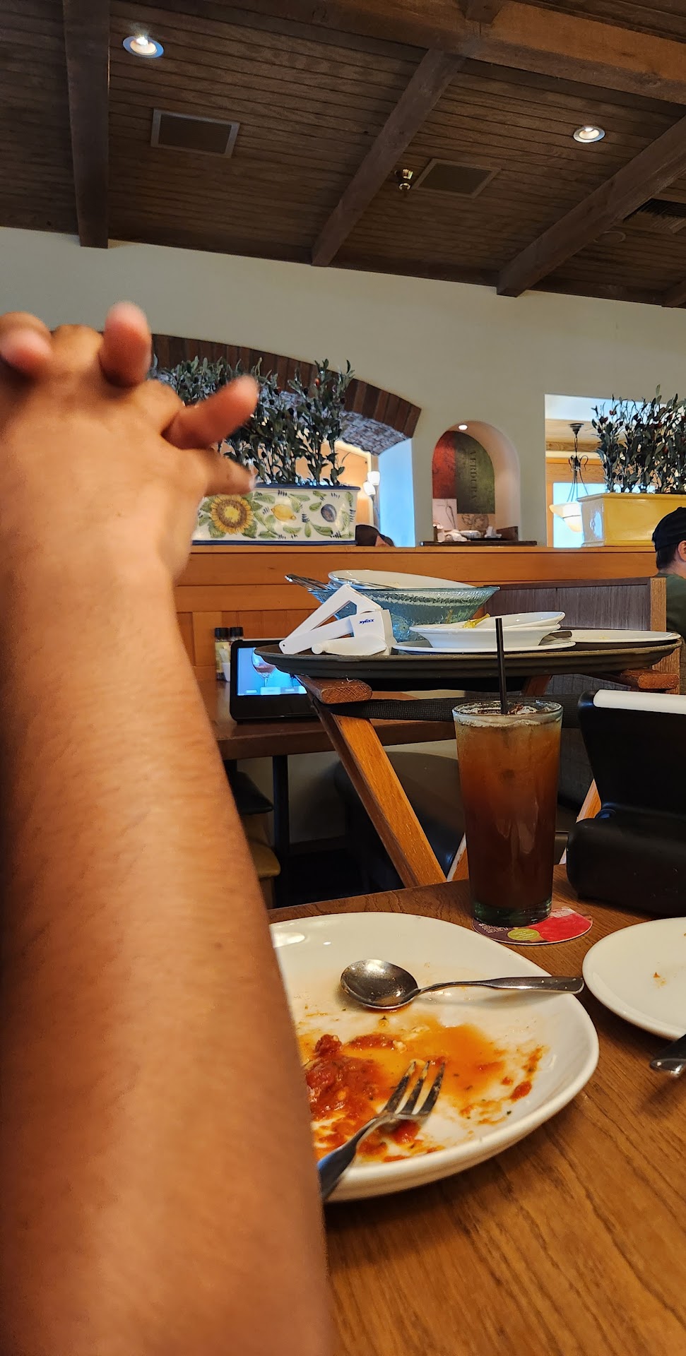 Read moreYikes, what a disaster. I mean, I know Olive Garden is always hit or miss, like 50%, it's OK. But dam Olive Garden, you really outdid yourself this time. Sunday evening, 7 pm, so yeah, I know it's busy and patience is necessary. We waited in the bar, we were going to order there, but the bartender was too busy to clean off the last customers' dirty dishes for 20 min. I get it, you're busy. She finally asked what we would like to drink, we ordered. Then I politely asked if she could take away the dirty dishes. She snapped and said she was going as fast as she could. The customers on both sides of us were being served drinks and bread over the previous customers' dirty dishes and dirty napkins as well, so I knew I needed to ask or she wouldn't remove them. It would take 20 seconds to remove the dirty dishes. But she didn't want to. F- ing gross Olive garden. So we opted to wait for seating in the regular restaurant. We didn't even complain at all. Thinking,... whatever. Got seated. Took another 20 minutes for the server to come. Our server was super slow, brought the wrong soup, then forgot to bring the right one. We ordered a second soup, and she forgot that too. 1 hour and 40 min later (not exaggerating) got served our dinners. The noodles were legit "Crusty" and super dried out. They obviously had been sitting in the warmer for a long while. She never came back. Yep, had to be a Karen and talk to the manager. 2 hour ordeal and still hungry. Also, the bathrooms were filthy, literal poo and paper towels on the floor. Come on. Foul and unsanitary. This Olive Garden should just shut down....
