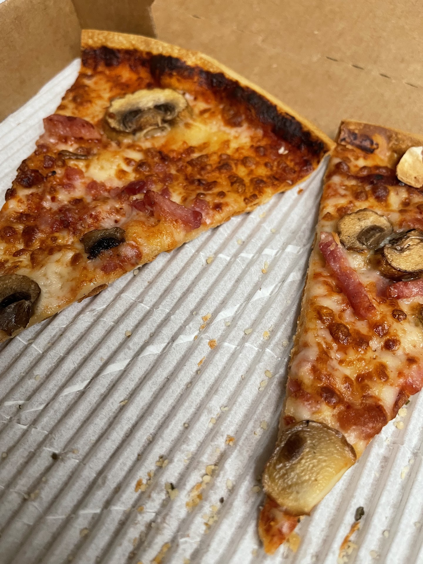 The pizza's were dry, burned(overcooked) and looked like they had been sitting in the warmer for an extended period of time.