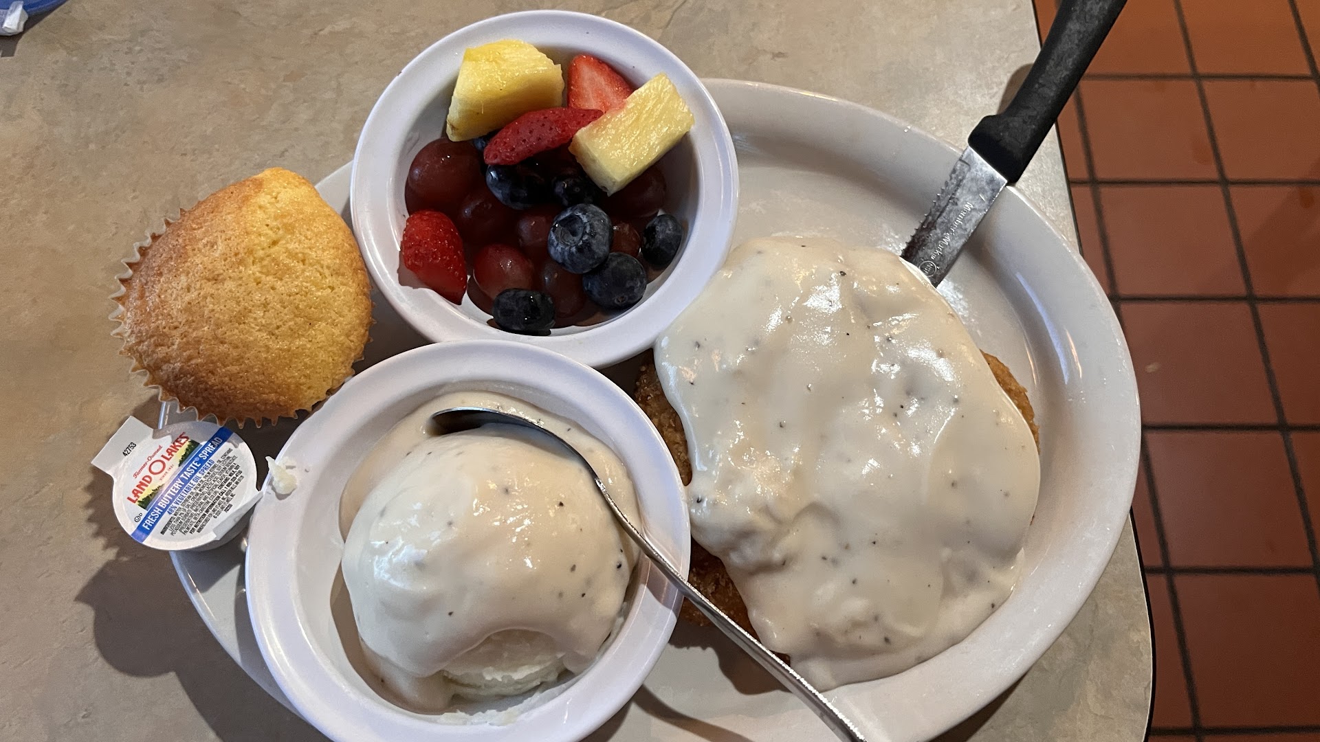Next came our entrees- country fried steaks with white gravy. Breading on country fried steak was delicious! It was light and didn’t upset my stomach (sensitive to fried foods). This was the Wednesday special, so we got 3 sides instead of two for the same price as Senior Special. In addition to a salad, Husband got apple sauce & mashed potatoes. I got the potatoes, too, and fresh fruit. I can’t stomach cantaloupe which came with the fresh fruit. Instead of a smaller portion, Jerry got me more grapes with the pineapple, blueberries and strawberries. We both got a corn muffin. Everything was so very good.