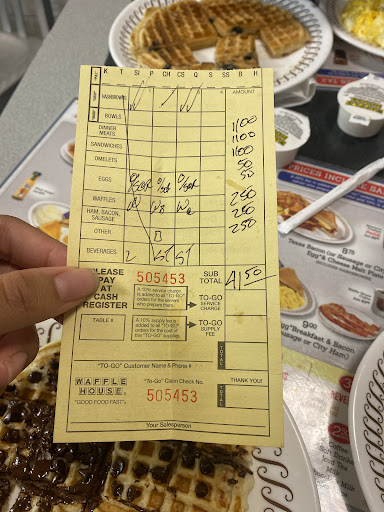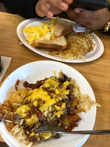 Read moreIt was a strange experience for sure! There were only two people working rhe store. The at least late 40's man cook. He can cook good. But no gravy and the bisquits were frozen we found out. It was about 6 at night. The younger waitress was so exhausted you could see it on her face. She had to buss tables, take orders, get drinks and all the extra things the waitress does us deliver the food. I could feel the tension i. The room. My food was cold as they had the air conditioner on full blast. Apparently they ran out of clean utensils and she recommended giving the to go utensils and the cook fussed at her really loud saying that would cost the company money. Washing any dishes with all the people in there was too much for her and being tired and yelled at she just got fed up and left! That left the Superstar cook alone until someone got there. He said some really hateful things about her to all the customers. It was all we could do just ro be quite. First time we had been ro this waffle house. Food was good but cold, and the man that worked there over 20 something years could have been more kind. I wouldnt have minded plastic utensils. At least I know they are clean. The food was good the...