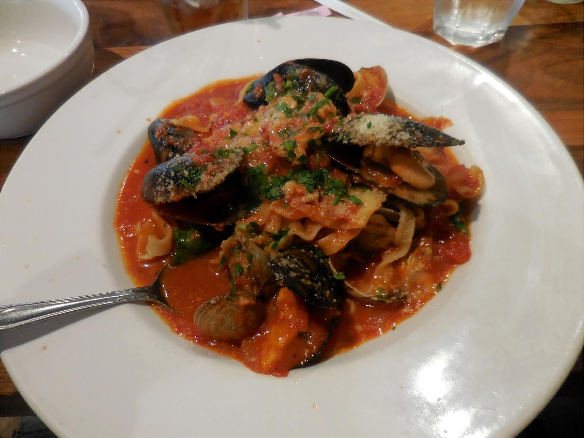 Fast forward- my mom asks and another server brings out our food. Her chicken sandwich arrives lukewarm clearly had aioli on it that was wiped off. My fettuccine arrives afterward without the garlic bread it comes with on the menu. I start eating, my mom asks politely for my garlic bread. They bring it ten minutes later. At this point nobody has even offered my mother and I a glass of water.