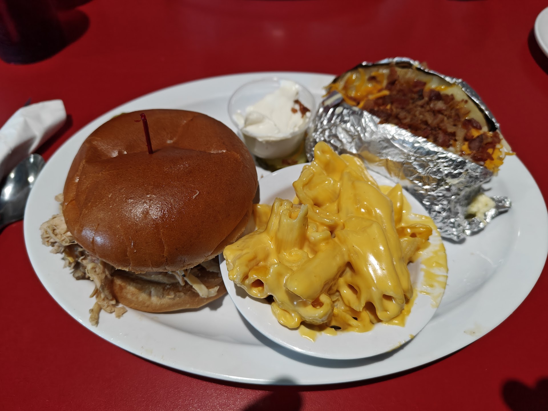 The chicken...mediocre at best. Even when ordered as a 3rd meat, it only comes in it's pulled form. The chicken was also a little dry, but did have some good seasoning to it. This isn't bad, but when you don't serve bread with your BBQ plate it's sucks.