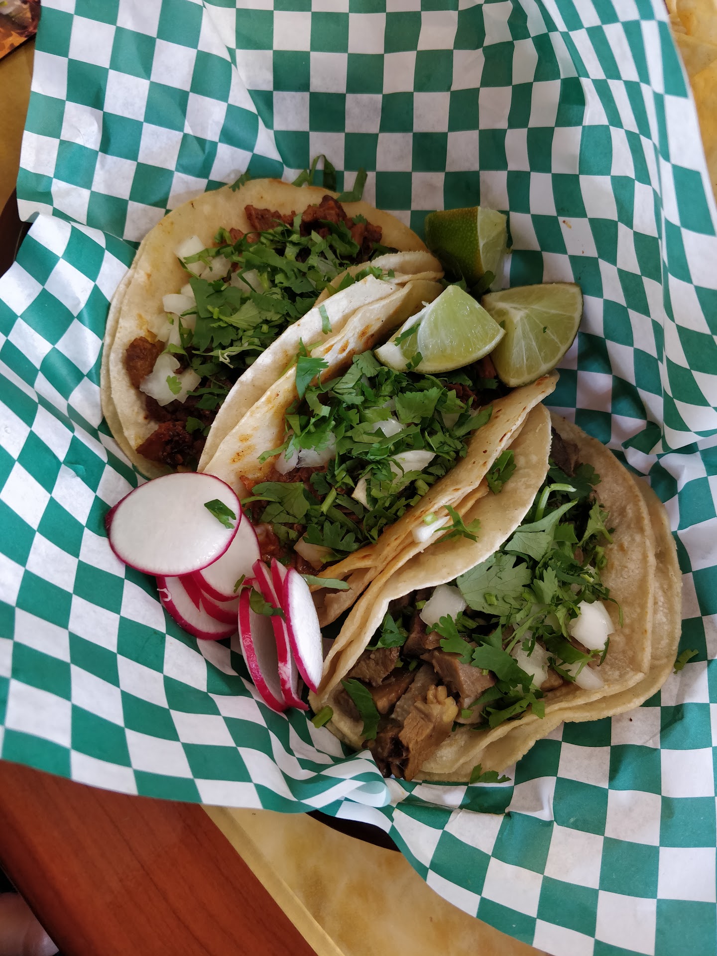 The tacos were delicious. The meats were hot off the grill, the vegetables were crisp and fresh, and the tacos themselves were fresh and flexible. The food all had a fresh and perky feel to it. It did not feel greasy, or stale, or oversalted.