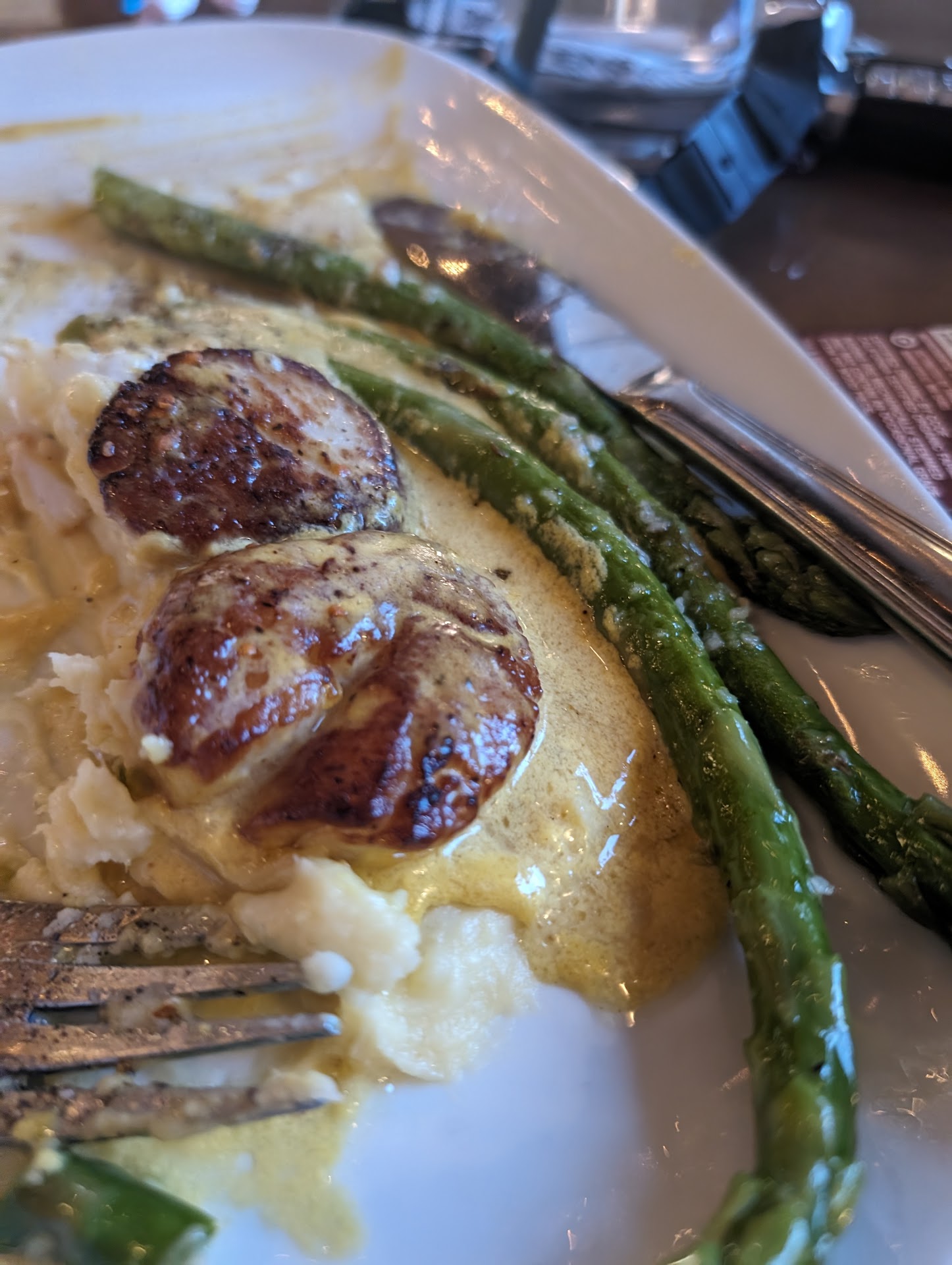 The entrees came next and out of seven of us there was one mistake and my wife received the wrong dish. They took it back and made it right, but she had to eat a little after the rest of us. When she did receive her dish (Miso Salmon) it was very good. I had the "smoked" ribeye. This unfortunately was NOT good. I ordered medium rare. I'm not sure how they did this but half of it was rare and the other half medium. I don't mind a steak on the rare side so I went ahead at ate it, once again no smoke flavor and the sear was a bit too much, very tough to get through. Potatoes and asparagus were okay. The real problem came almost immediately after when I began to have major stomach aches. There was definitely something that did not agree with me, and I spent the rest of the evening in a very uncomfortable state. I might give them another chance down the road a bit, but only because the service was excellent. Hats off to the staff, they are what kept this night out from being a total bust for me. I hope the next time I visit it goes a bit better. Our community needs more restaurants...