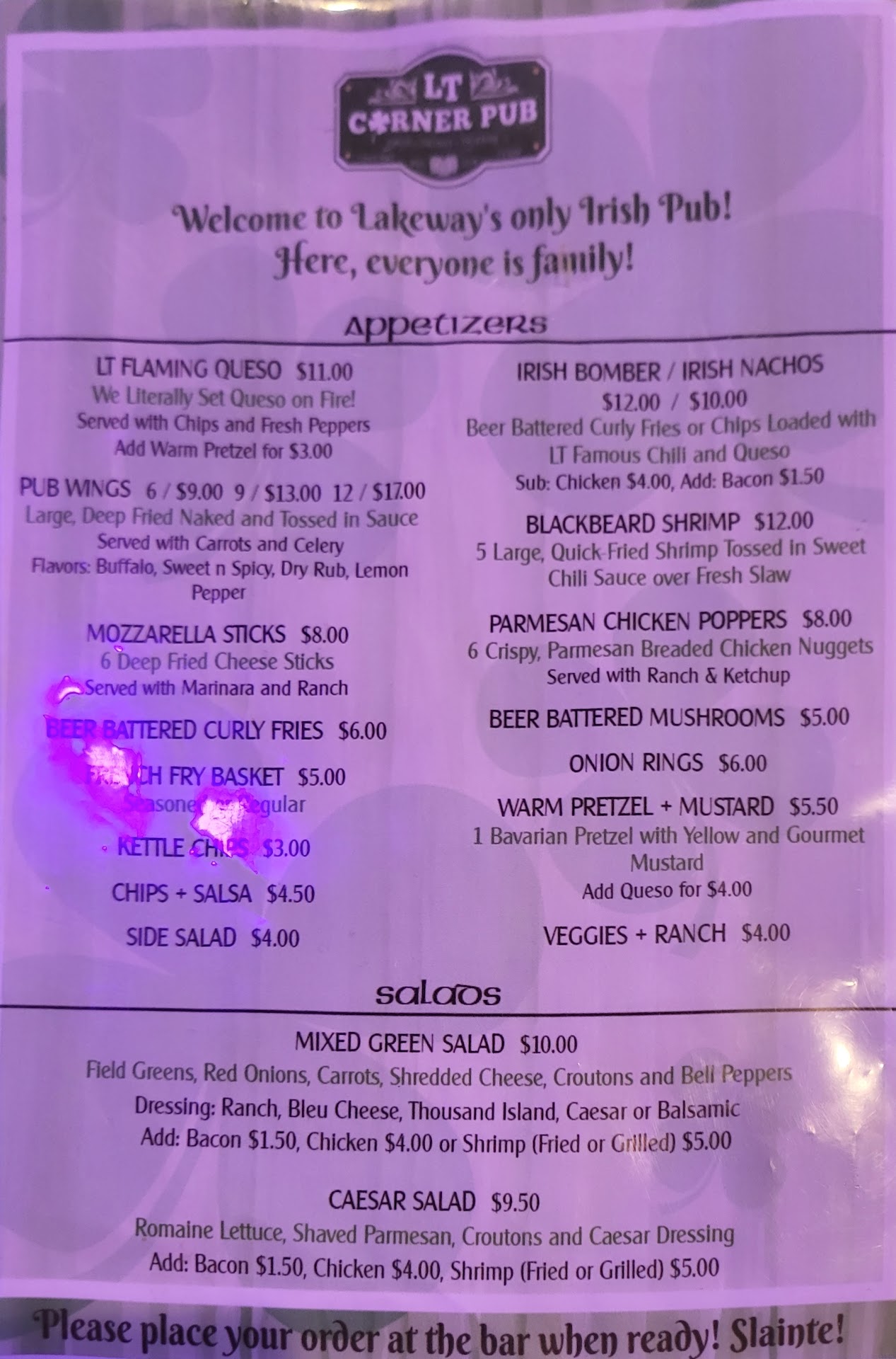 Based on the great advertisement on-line for this place, drove with family and friends all the way from Dripping Springs to watch Nascar and eat fish and chips in this âIrish sports barâ. Arrived to find a pleasant place with the bar area full of late Sunday afternoon regulars. No one else there. They were out of most of the on-tap beers with the bar tender trying to get carbonation sorted out on one of the few beers they had. My wife wanted a Chardonnay from a long listing of wine they had â they only had one bottle of white at all. We ordered food â no fish and chips or most of the other foods on the on-line menu. Settled for Shepardâs pie after we order Bangers and Mash that never came (only to find out an hour later they donât serve Bangers and Mash). The Shepardâs pie came and looked like strained Beefy Campbellâs soup wedged between 2 scoops of HEB microwaved mash potatoes.