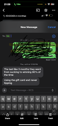 On top of that, a friend who worked there sent me these screen shots of texts messages between the owner, Nic Patrizi, and her accusing us of cheating and stiffing. As well as a screen shot of the employee group chat, of over 45 members, where Eric J. is describing us as "the cheaters" and again not tipping, which is false. It's humiliating and degrading knowing that every time we walk into this establishment we have a name on our backs by which every single employer recognizes us.