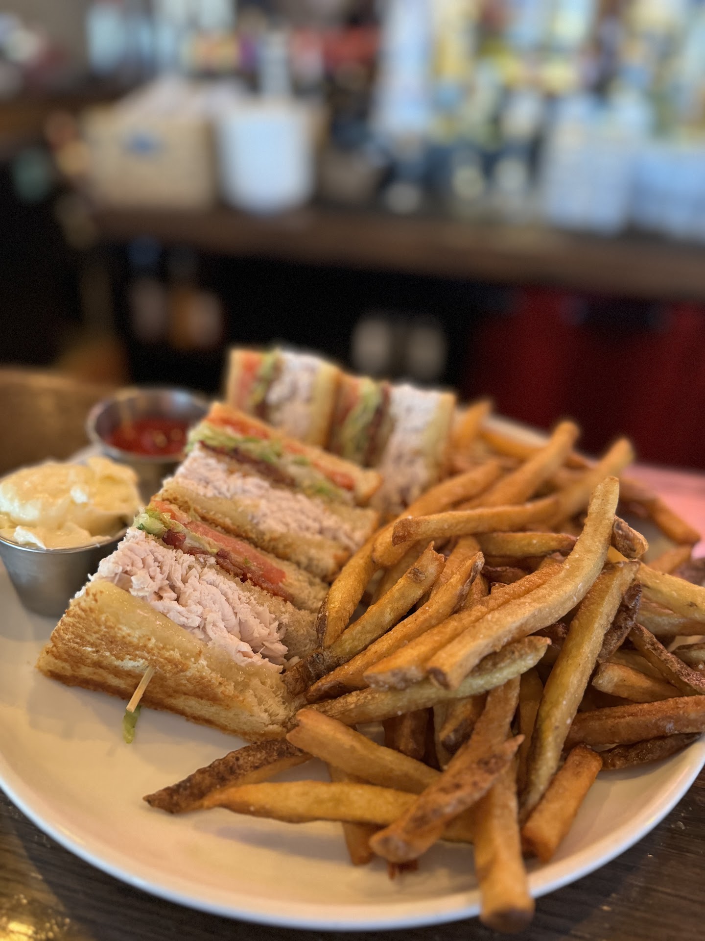 I ordered the club but noticed it was served with "aioli" and I was VERY specific with the server that I could not have aioli. Seems simple... but I guess not. I received my sandwich and the bread seemed fried instead of toasted. I could be wrong but I would have preferred toasted. Fried toast is just too greasy. It came with a white cheddar cheese which I debated leaving on. I had no idea it was melted (not stated in the menu) and had I known it was melted, I definitely would have opted to leave the cheese off. A traditional club does not come with any cheese and this is mostly supposed to be a cold sandwich and cheese is just too much when it's melted. It comes with shredded lettuce like you would find on a taco instead of a crisp piece of lettuce. Because the lettuce was shredded, the lettuce was really soggy. The tomato was minimal but not as minimal as the bacon. Instead of strips of bacon, this was more like bacon bits you would fine on a wedge salad. And to really add insult to everything else... it had aioli on it! Despite emphatically asking for NO aioli... not even on the side, and definitely not on the sandwich, there was an overwhelming garlic taste which ruined the entire sandwich and made it inedible. I tried eating one quarter of the sandwich but it was simply revolting. Worst of all, when I looked at the bread, you could see where the aioli had been spread on the sandwich, but someone apparently later realized it was supposed to be without, and removed it. But what that person doesn't seem to understand... it's too late. Once you have put that on the bread, as much as you might try, you are not going to remove that garlic taste. It was almost as if it was intentional because I ordered something special. How hard is it to start over? Toast new bread and start over? But no... they had to use the bread that aioli had been slathered on and then they tried to remove it. This just screams to me how little they care about the food they serve and how little they care about their customers.