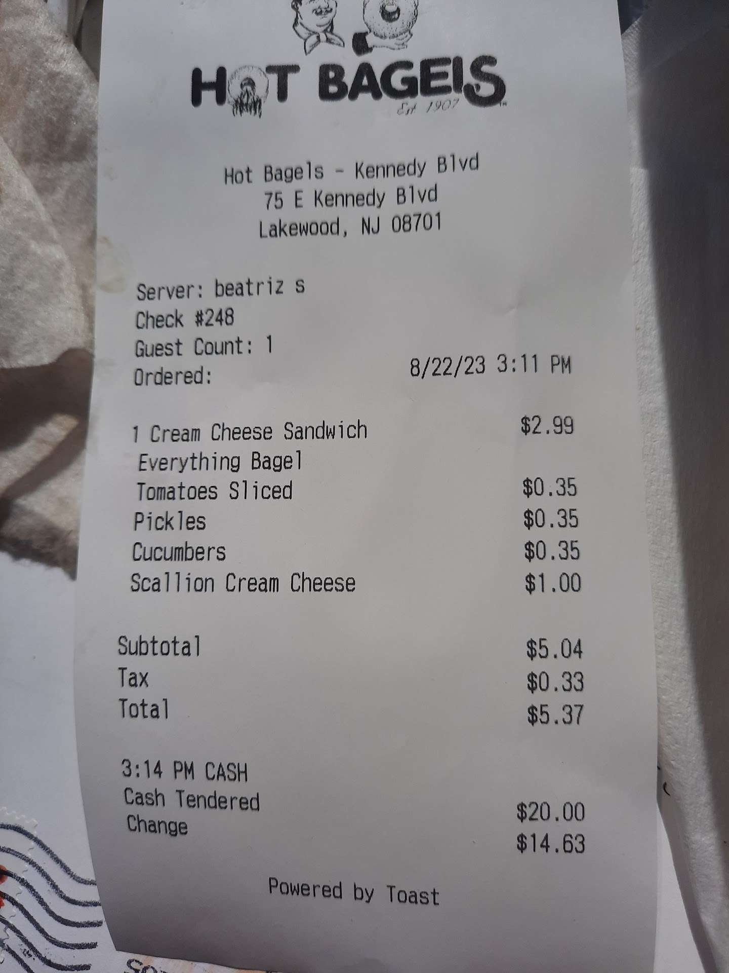 Read moreI am currently washing clothes across the street, I drove here but because of the snowfall I decided to walk across the street to grab a bagel for breakfast. It was my first time at Hot Bagel and although it was drive thru only (which I only realized when I walked in), I was still treated like a customer. They were kind, understanding and welcomed me with such a pleasant demeanor and allowed me to purchase my breakfast even without my car given the circumstance. I’m grateful for their kindness and even though I don’t eat Kosher, I’d be happy to spend my money there again. Thank you for your...
