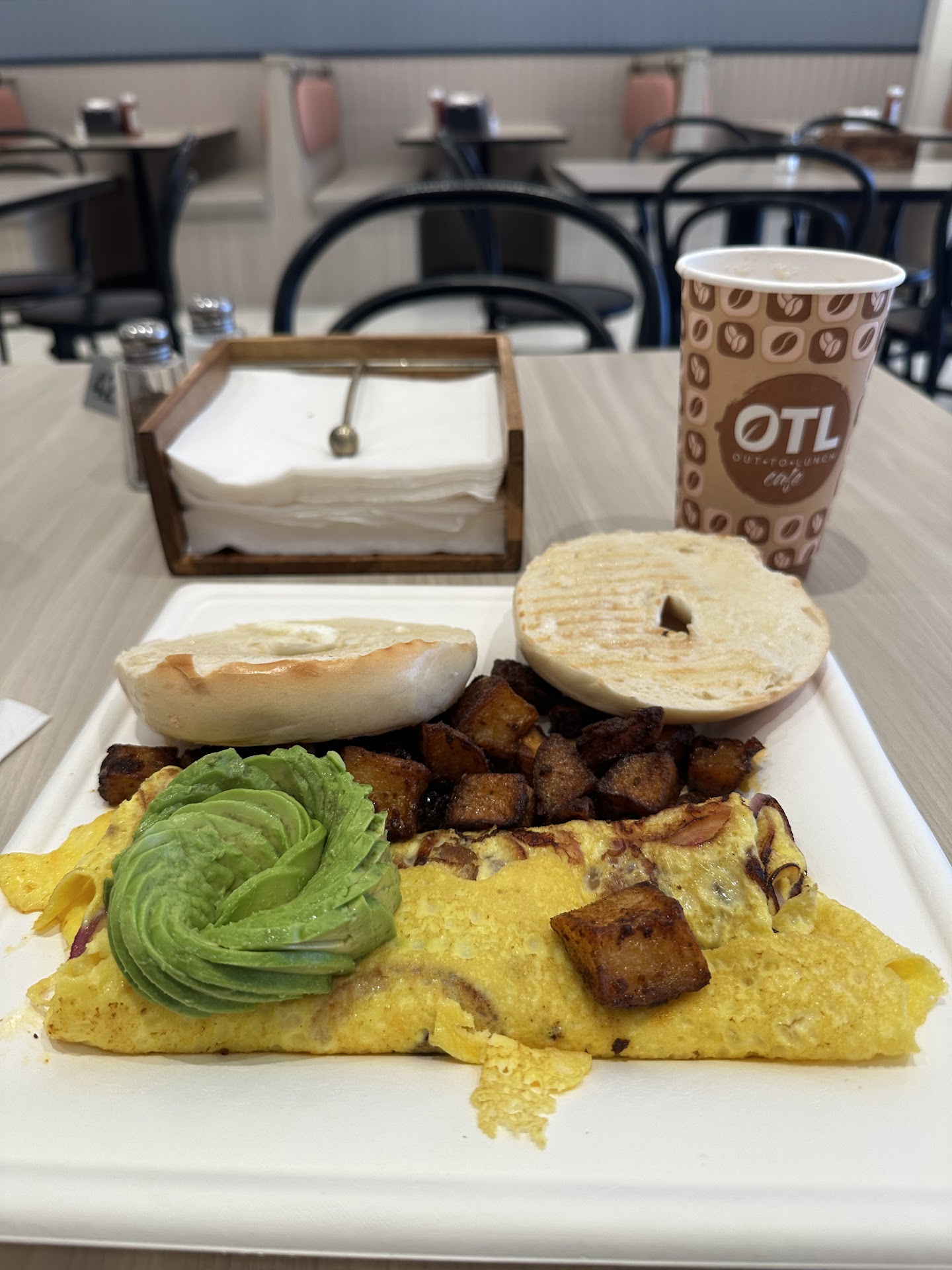 Looked at online rating: 4.8. So decided to have breakfast here. Opened at 730am, I was the first customer. You place your order with cashier or kiosk. Self service coffee. Little deceiving on line said cappuccino But it's from powder in coffee machine, Not from an expresso machine. Only had whole or low fast milk. No half and half. Had soy milk. House blend coffee was okay. Breakfast served on a paper plate. Home fries deeply fried. Omelette- some of the onions inside the omelet was actually cold. I went to throw out my cup and plate. Had cup in left hand and plate on right hand. I took 3 steps and the plate collapsed, My quick reaction was to place the cup under the plate to stabilize the plate.